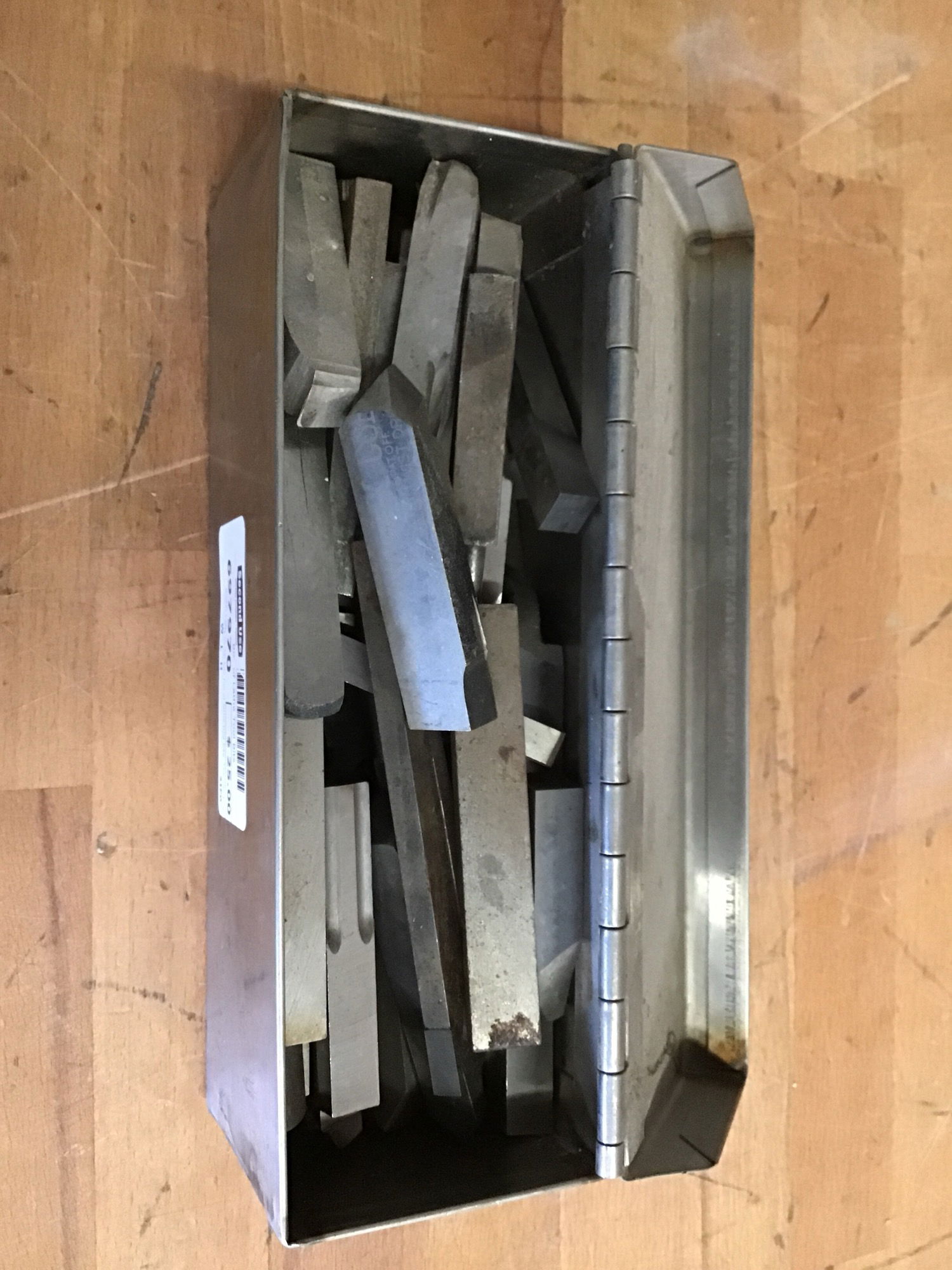 Sweet hefty metal box full of lathe tool bits. The value of the tool steel in here is way more than the price, not to mention the box by itself is probably worth it.