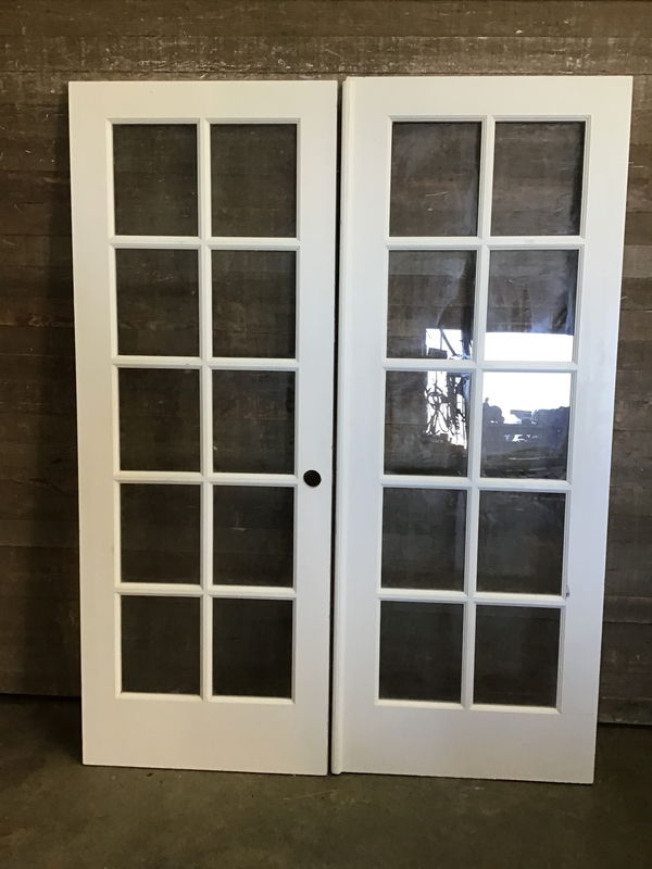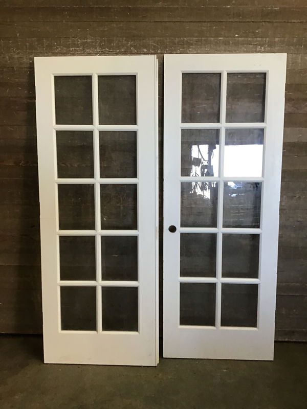 This pair of white french doors features 10 true-divided panes of glass each, pre-bored hole for standard interior lockset and matching wood astragal. Some drill holes from previous door blind installation. Some scratches along edges from previous use.