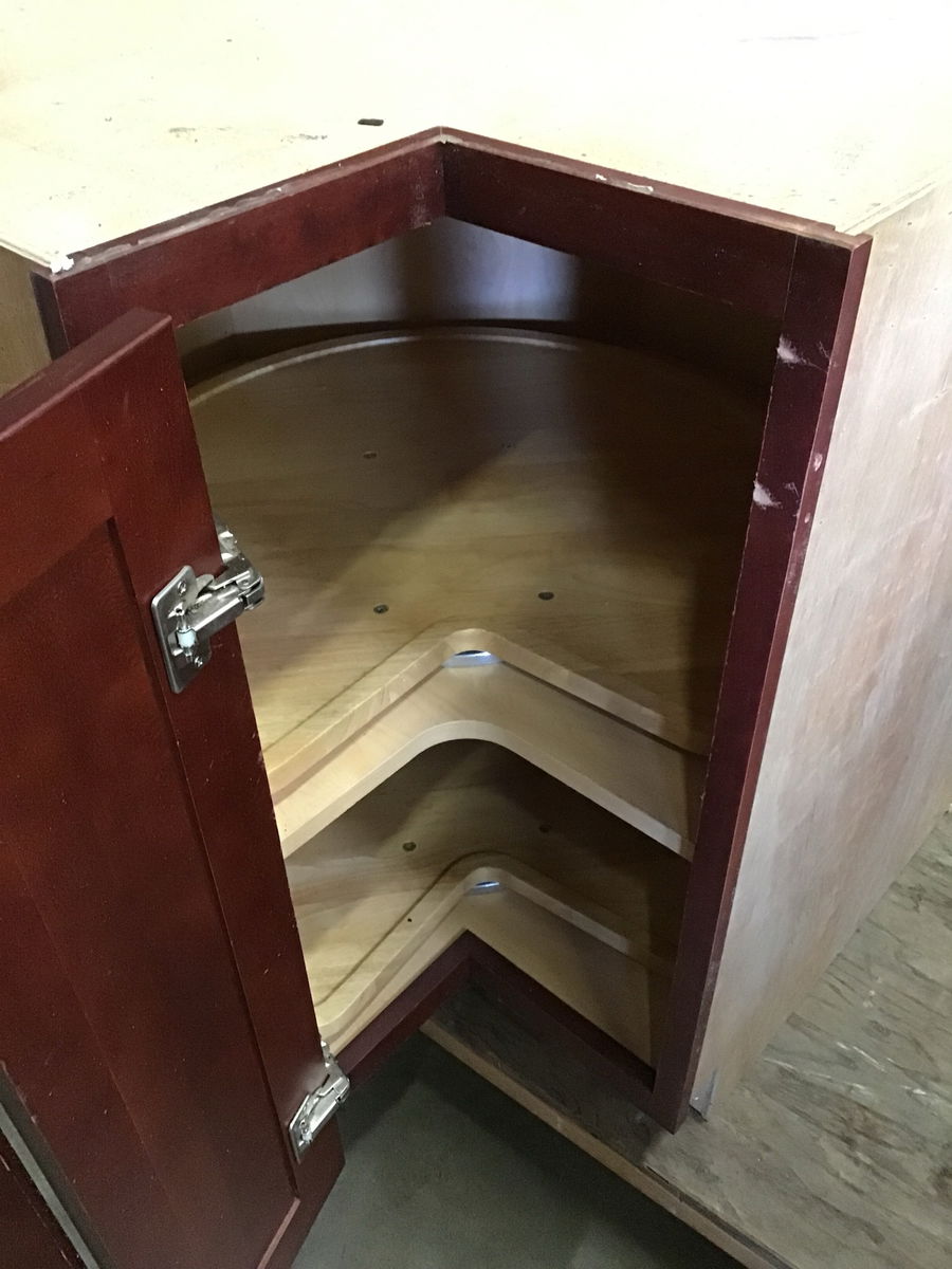 Stained maple faced corner cabinet with a nice looking two tiered wooden lazy susan inside. Face has some scratches from use wear.