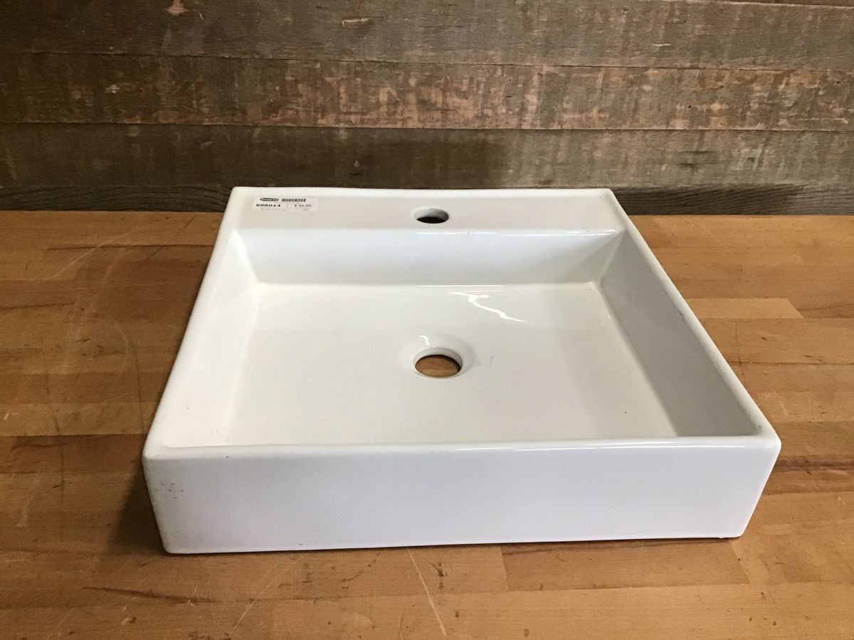 Crisp, NIB, porcelain vanity top sink. Could make a great vessel sink but the back is also designed to be wall mounted. Great for a small cute vanity setup.