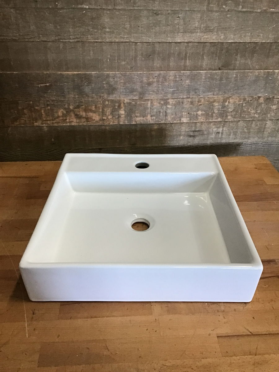 Crisp, NIB, porcelain vanity top sink. Could make a great vessel sink but the back is also designed to be wall mounted. Great for a small cute vanity setup.