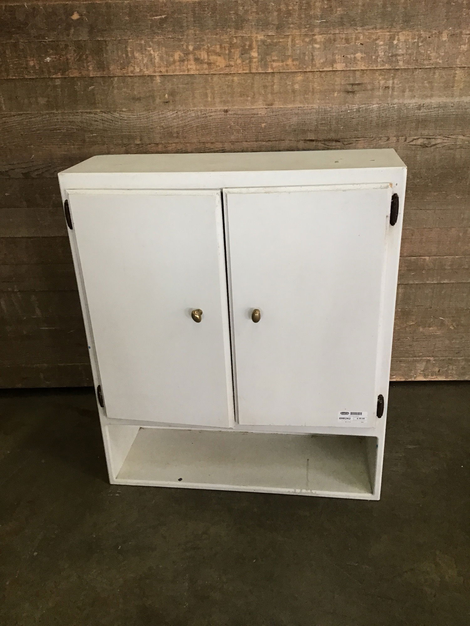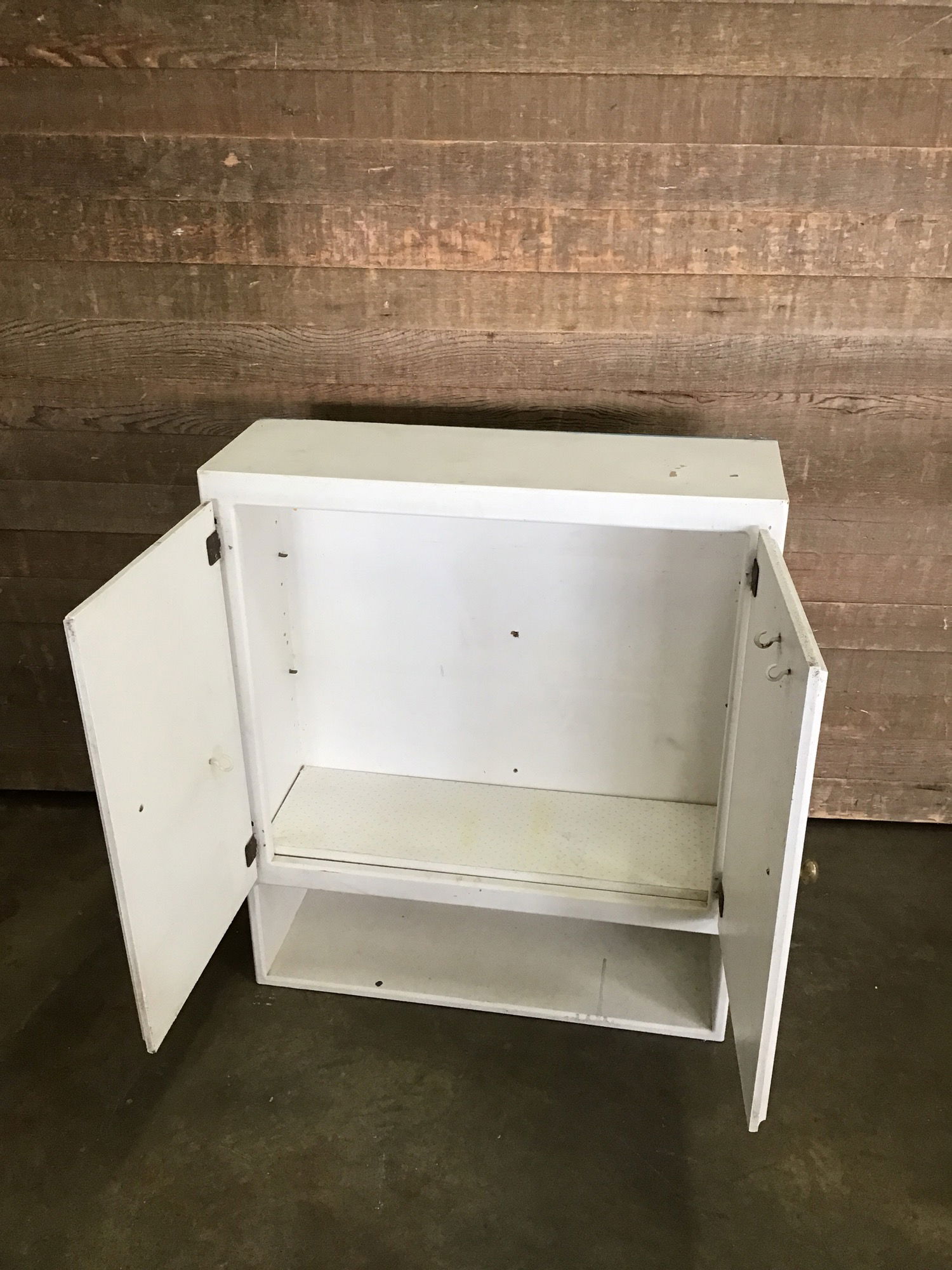 Upper shop cabinet in fair, used condition. Two doors with two adjustable shelves. There's an open shelf under the doors. Great for a shop or art studio.