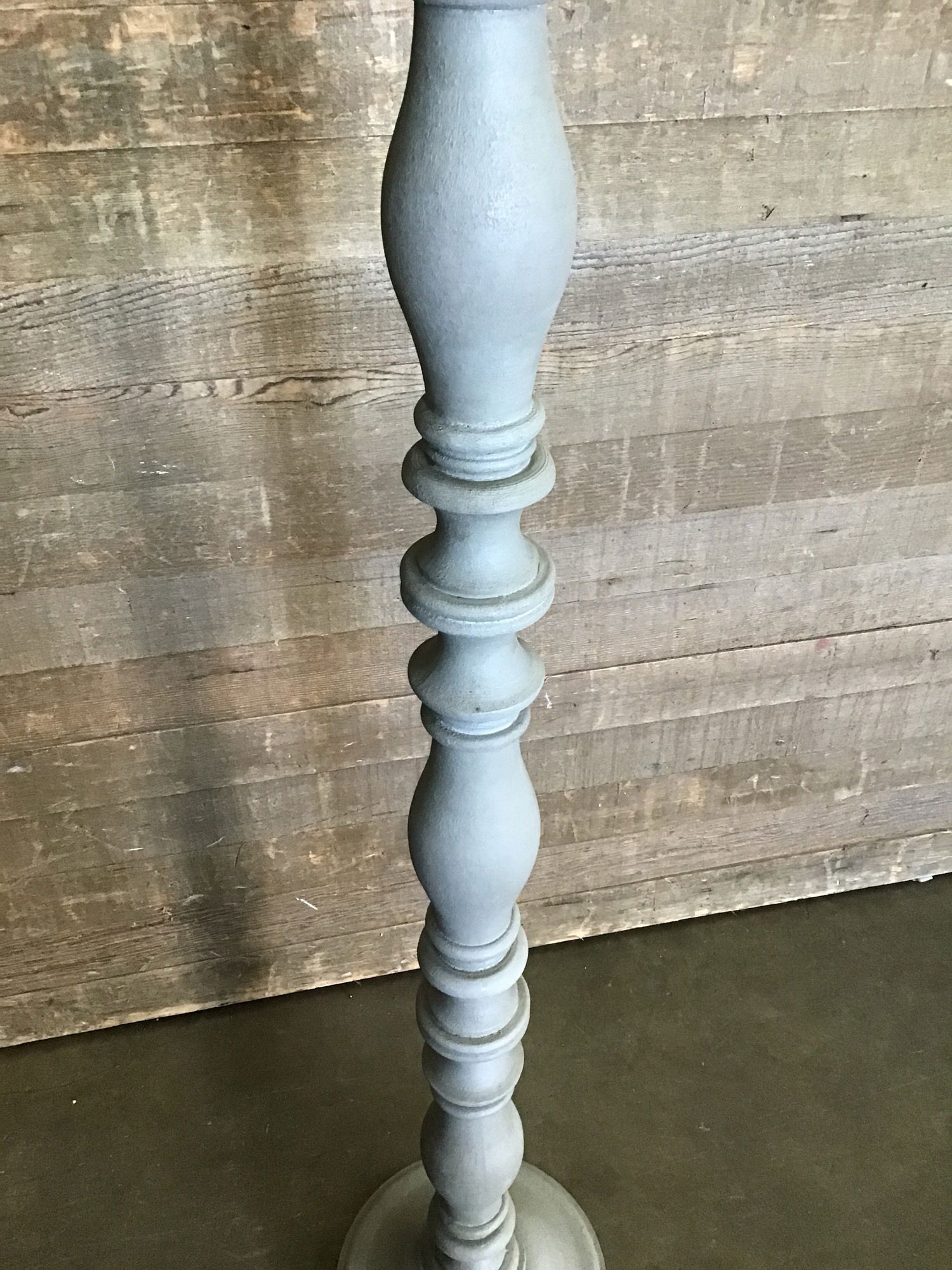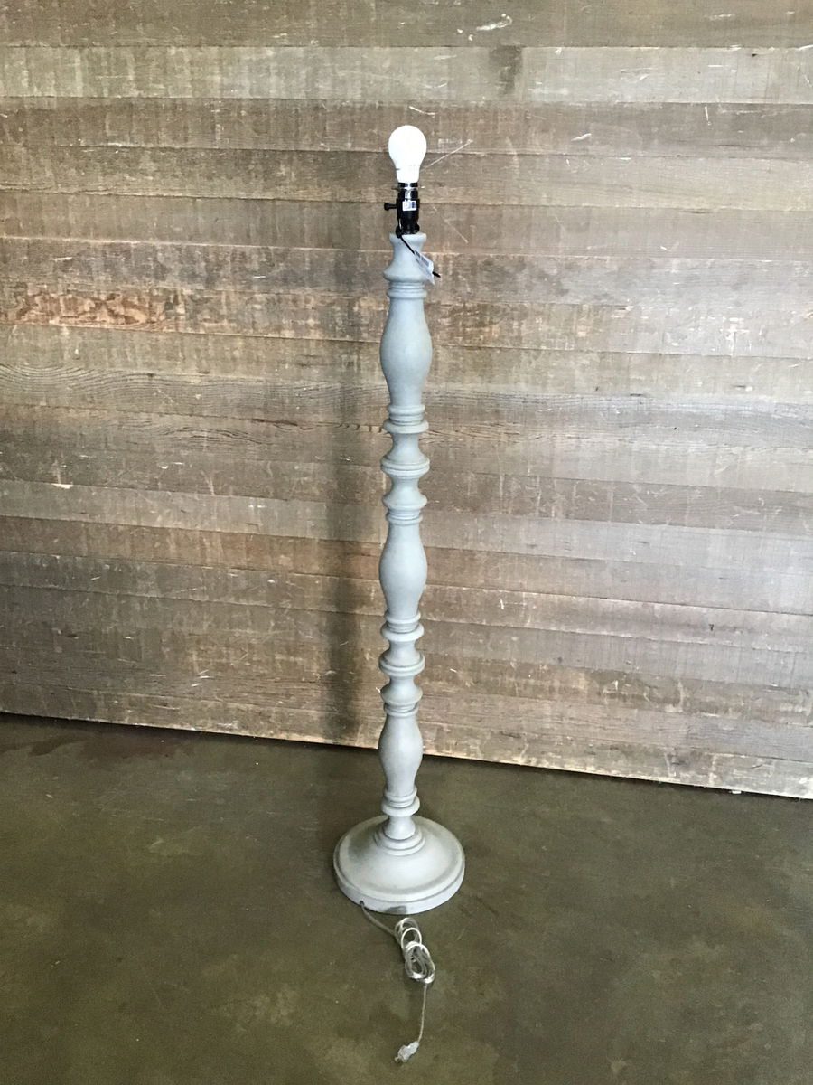 Light grey cast resin floor lamp in need of a shade. Tested in house and worked properly.