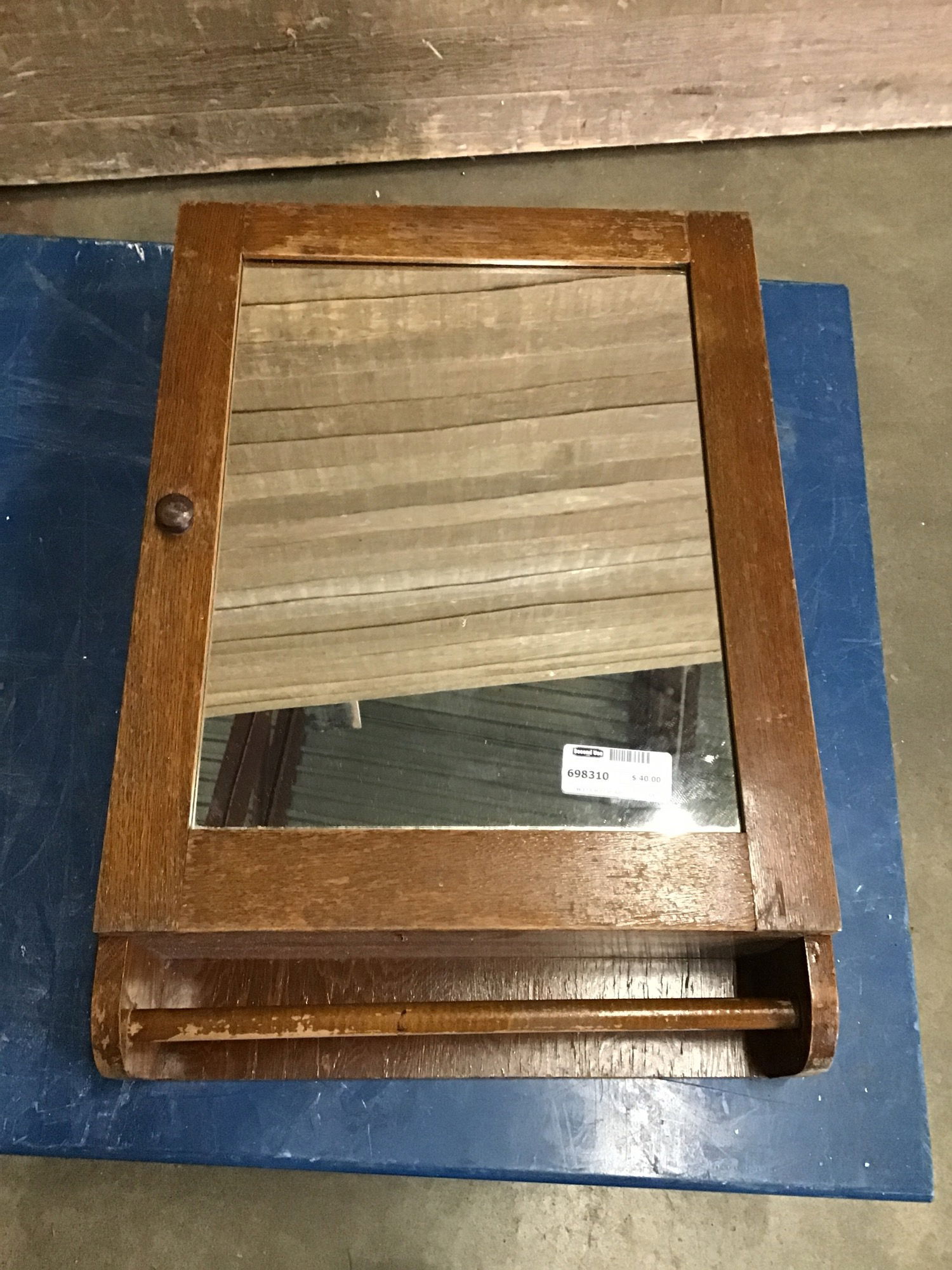 Solid white oak vintage medicine cabinet with mirrored door and towel bar below. Mirror has a few scratches, no shelves are included.