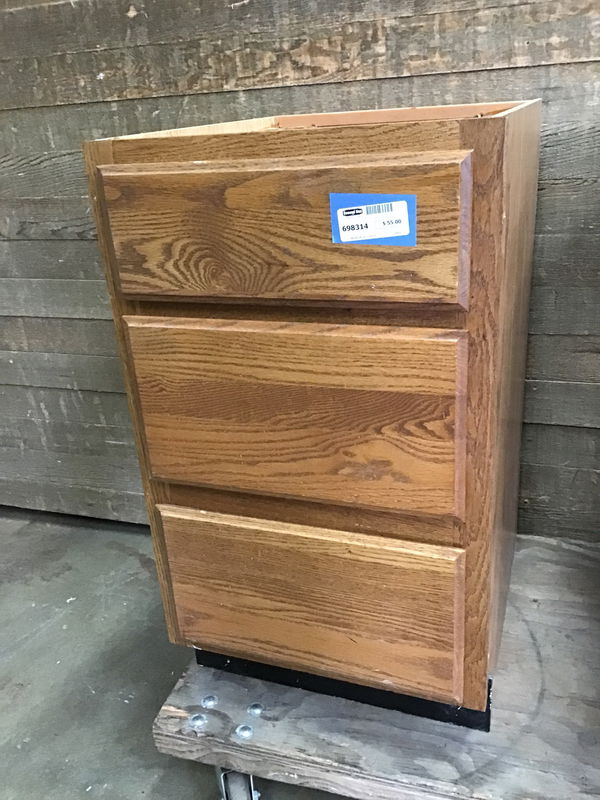 Three drawer oak base cabinet. Shorter than a standard kitchen cabinet.