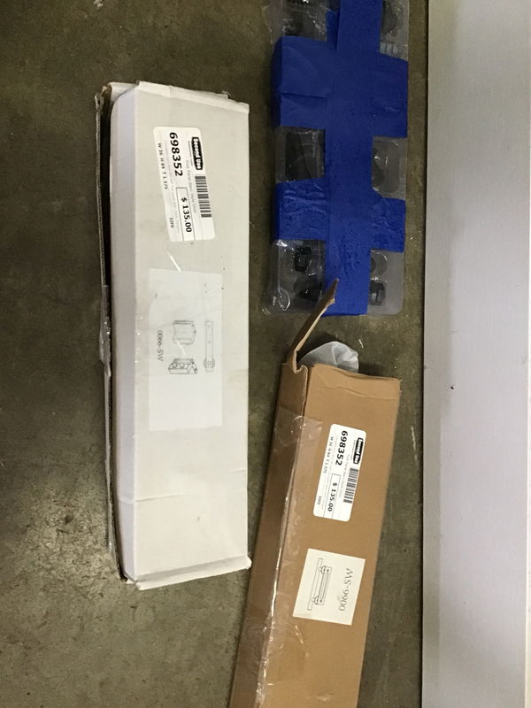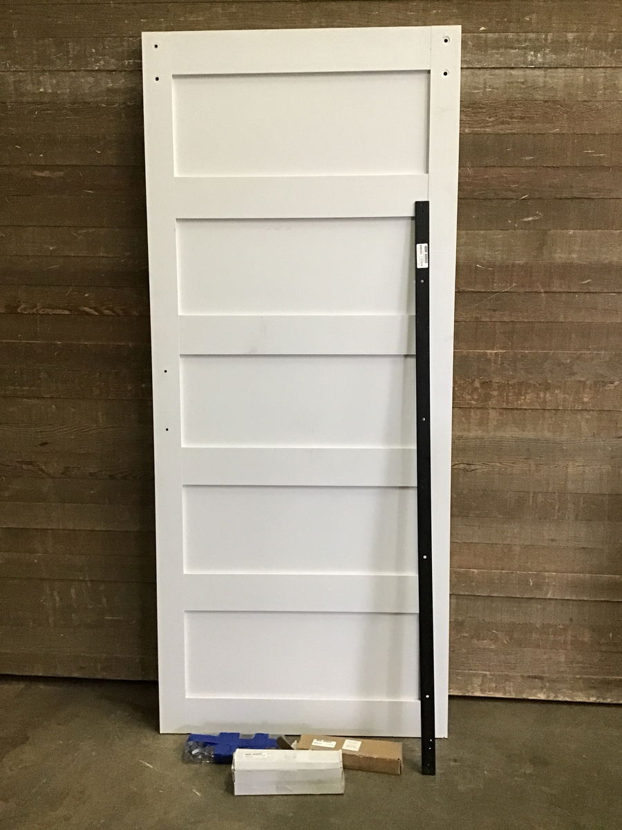 Complete barn door set with five panel door, track, hangers and handle. Looks lightly used. Looks a lot like one on Wayfair selling for $235.