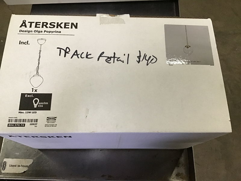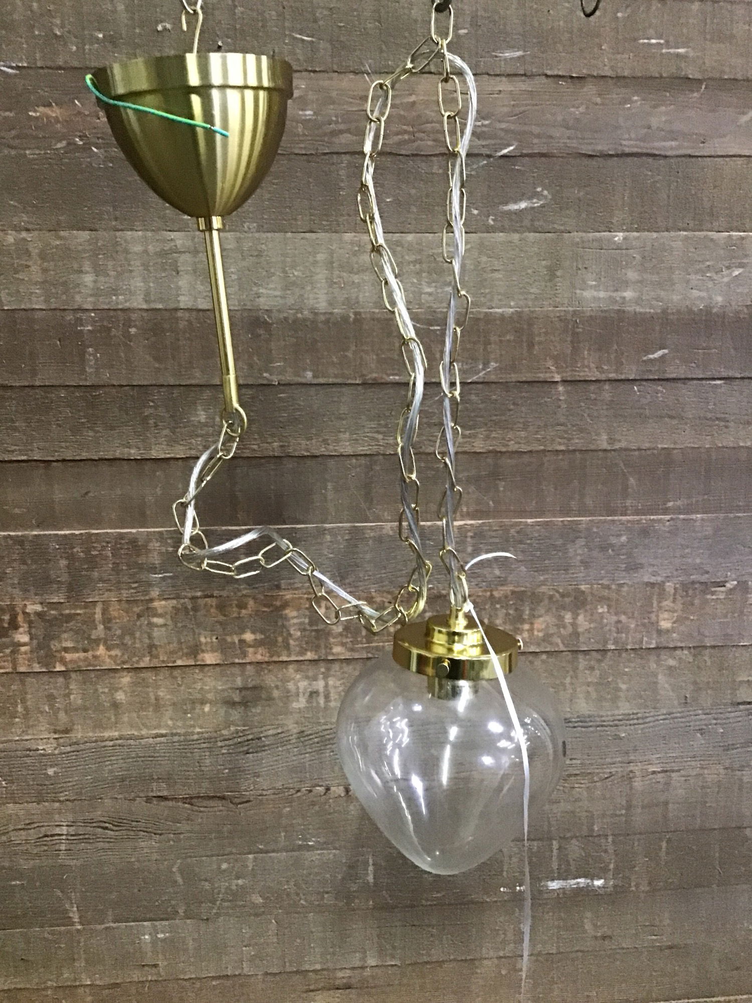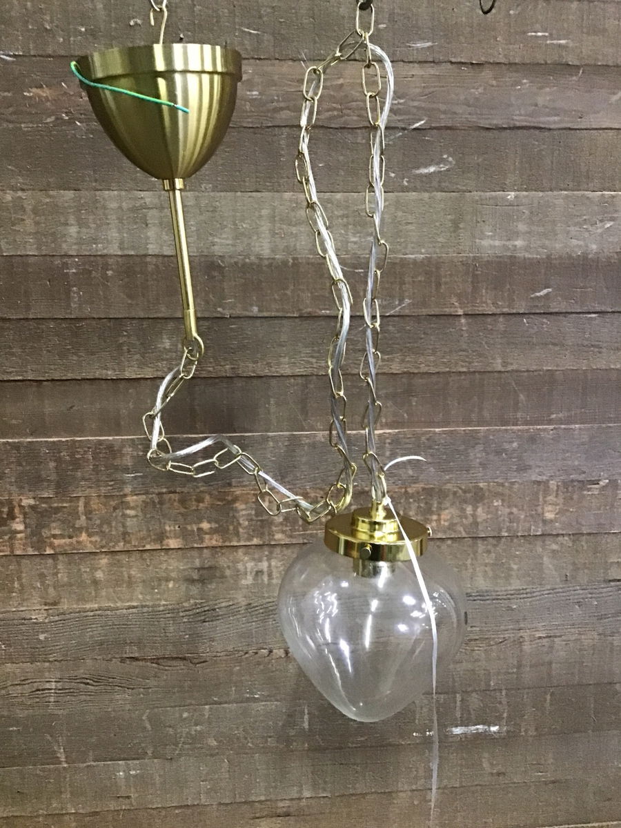 Brass pendant with onion-shaped clear glass shade, by IKEA. Came to us unused in the original box, where it remains.