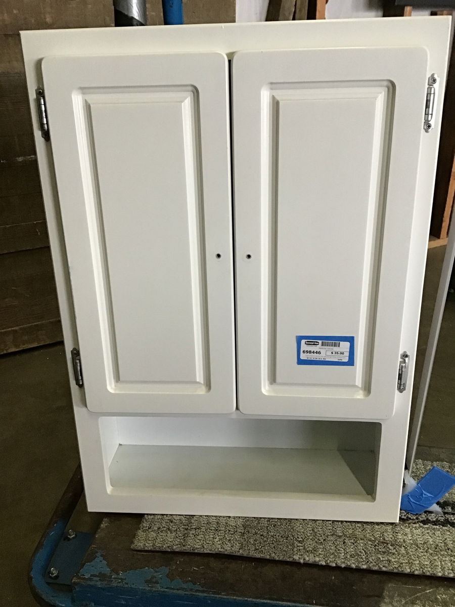 Large medicine cabinet with open storage below, plywood box and painted hardwood face. Comes with one shelf inside.