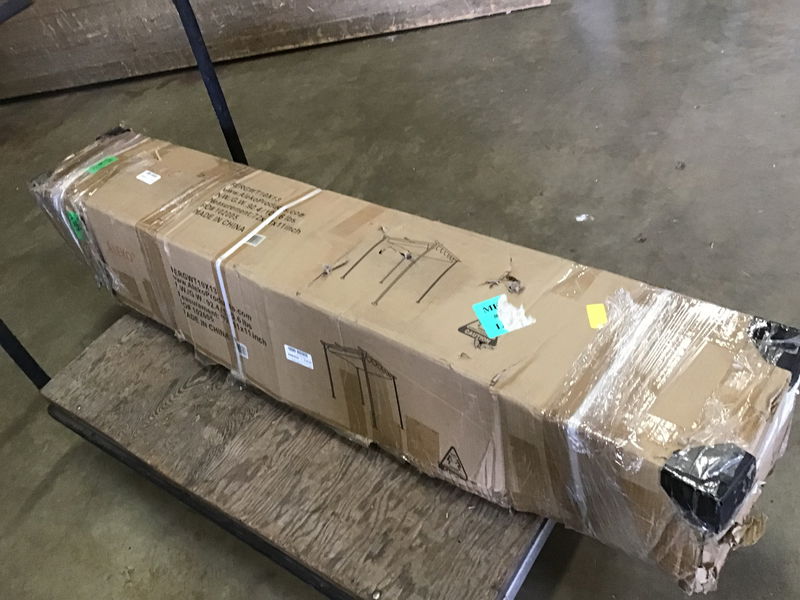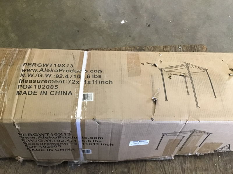 Steel (black) and fabric (cream color) freestanding pergola, unassembled, in original box. Never was put together. Comes with instructions, assembly required. First photo is of a similar (but not identical) unit assembled.