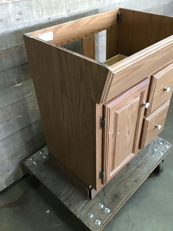 Very simple partilce board cabinet base. A little worn especially at the toe kick area but could make a great backroom cabinet on the cheap!
