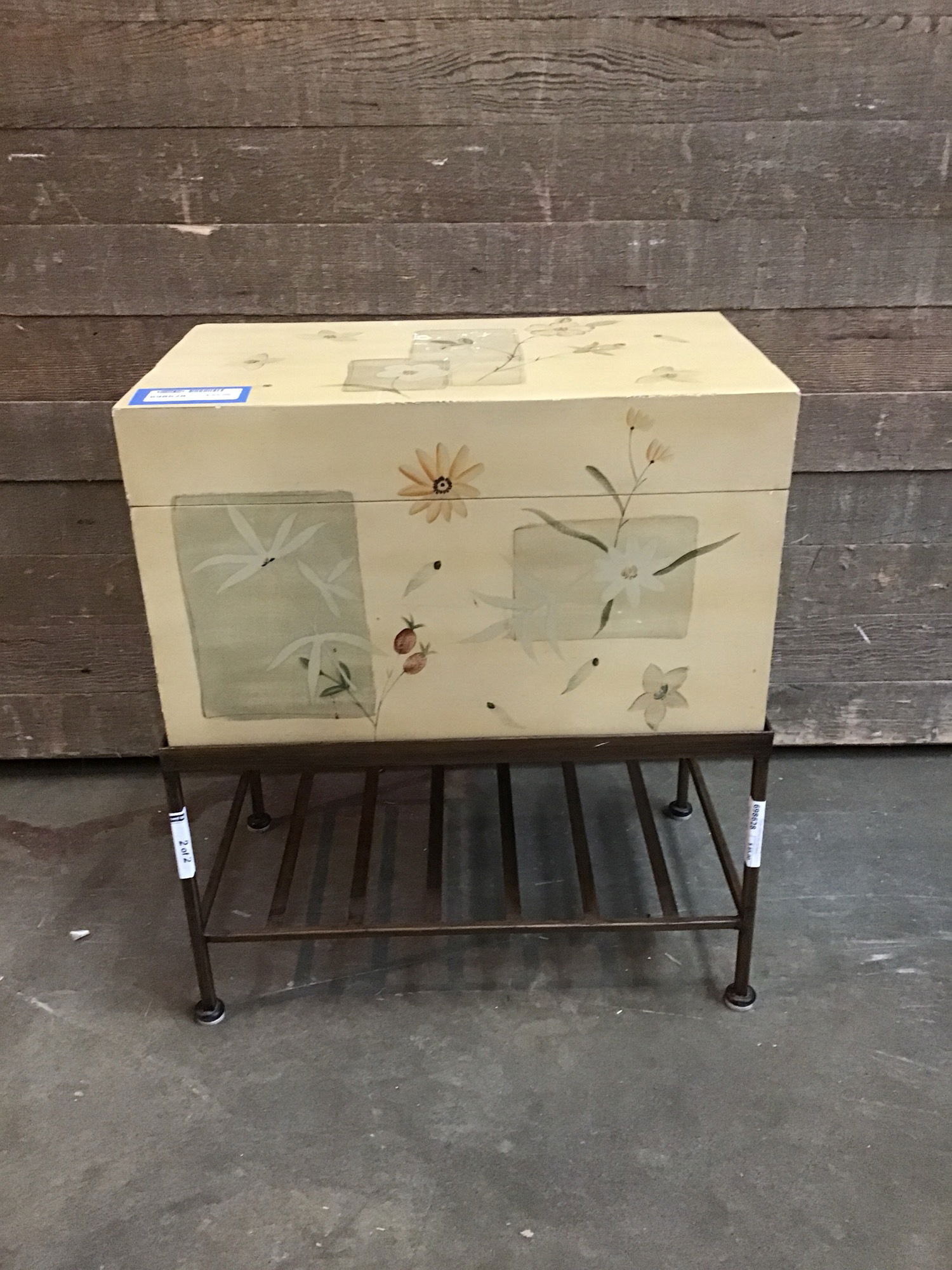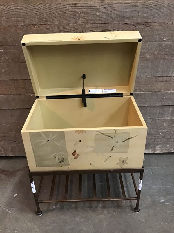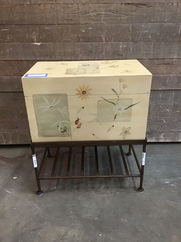 Cute lil wood box with a flip top, painted with flowers. On top of a metal stand. Could be a cute place to put your bottles of gin.