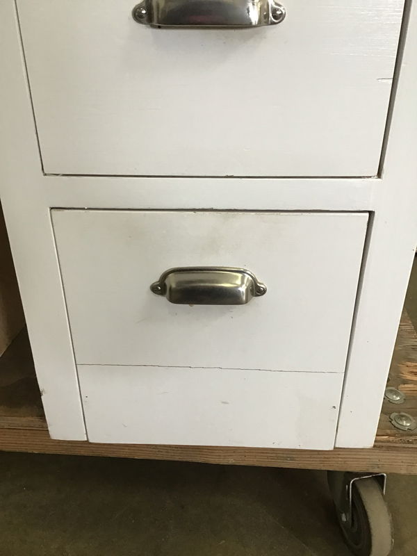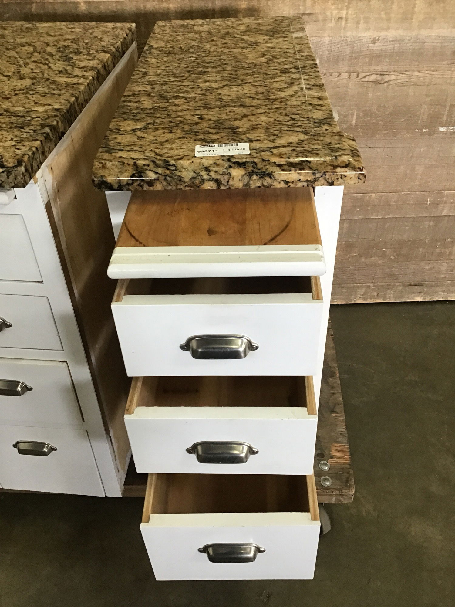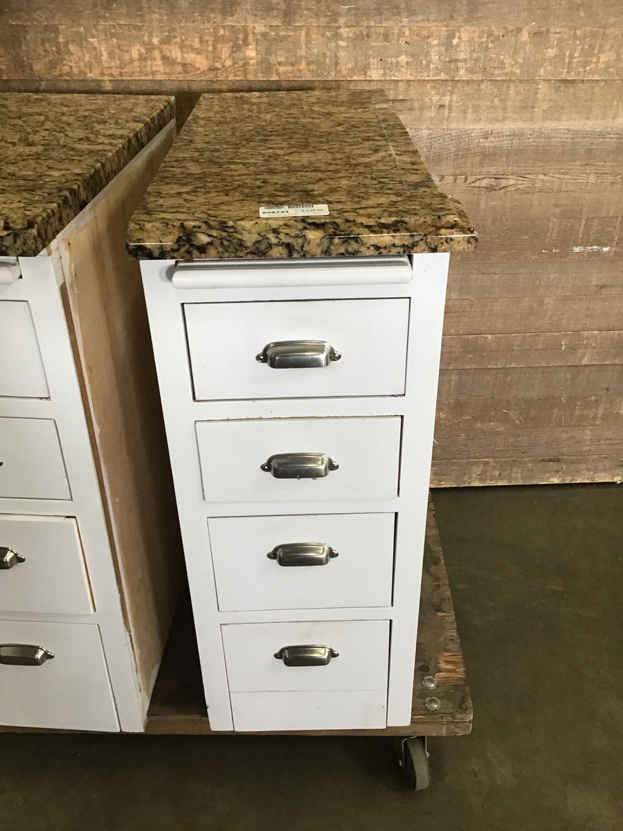 Base cab with pull out cutting board, 4 drawers and a plywood box build. Has been painted white and includes a granite top with a small ogee edge. Stands nice and sturdy. Drawers are all functional with only cosmetic damage to the face of the bottom one.