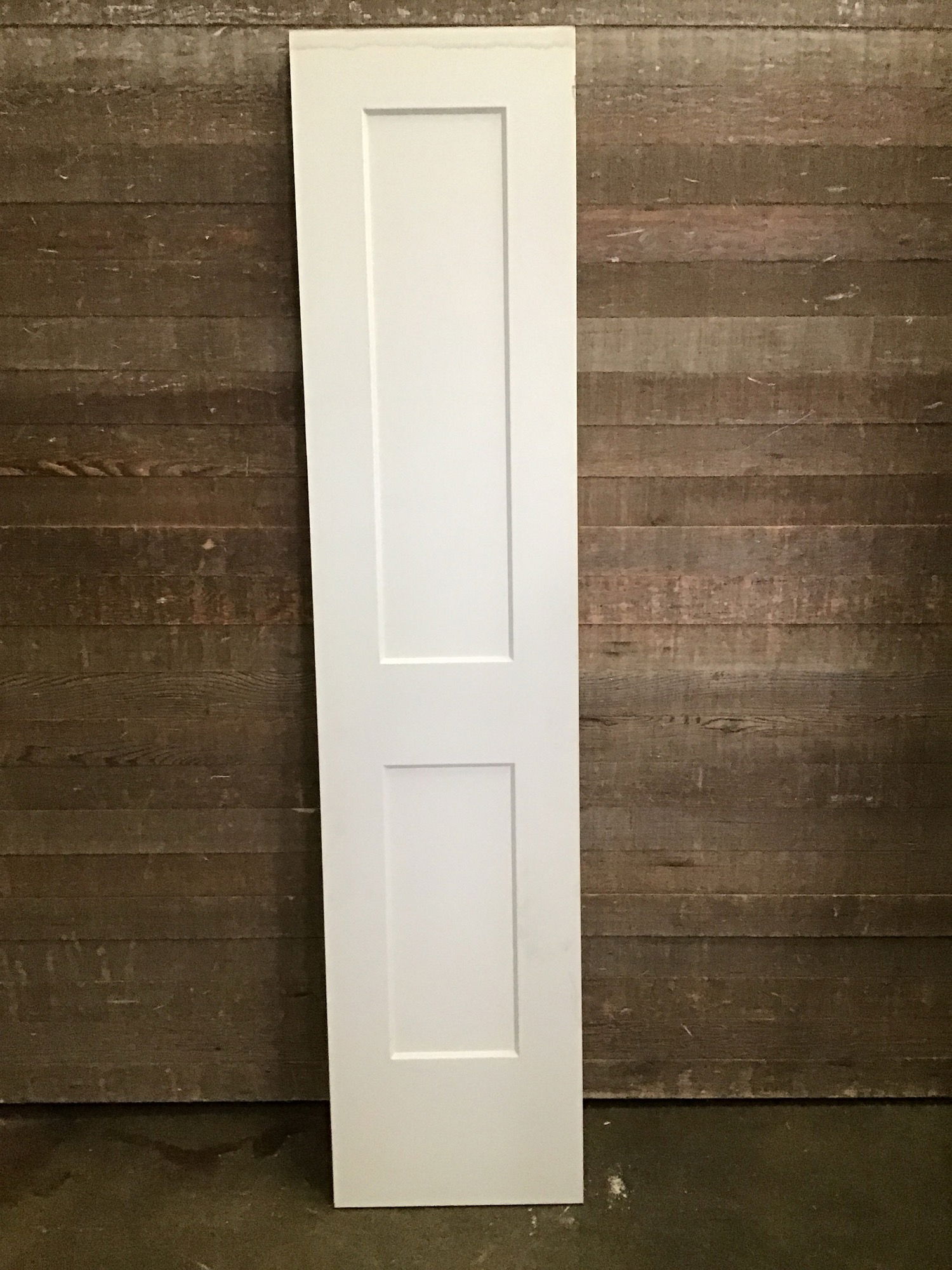 Molded two panel door, undrilled and never installed, but does have minor water staining along top edge.