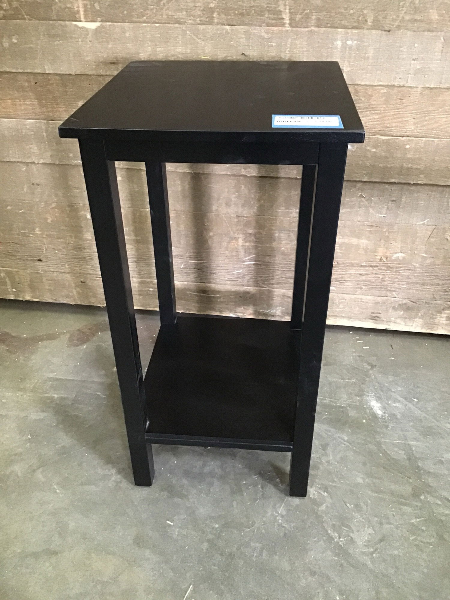 Compact black side table with shelf below, in a black finish.