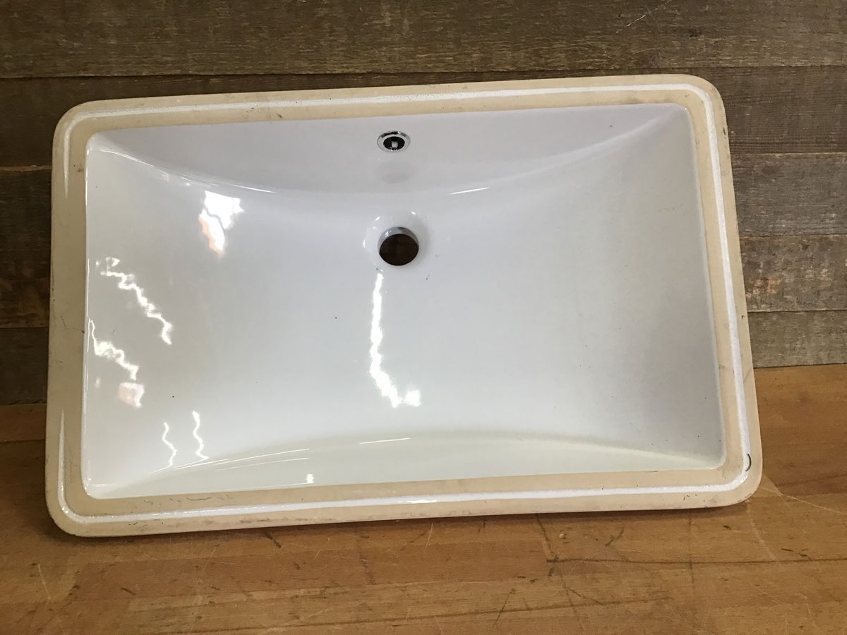 Classic rectangular porcelain undermount sink, white. Appears never to have been installed.