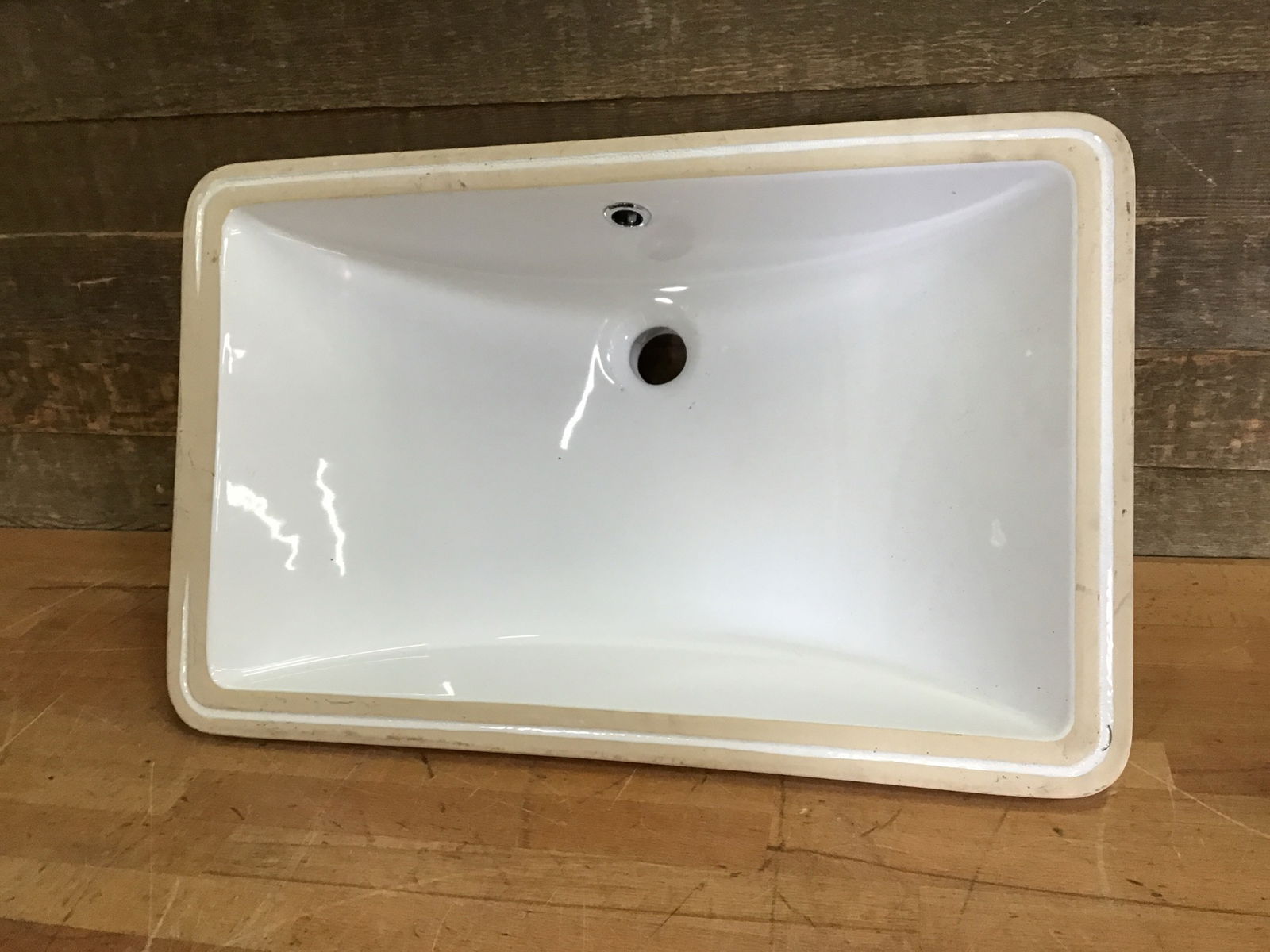 Classic rectangular porcelain undermount sink, white. Appears never to have been installed.