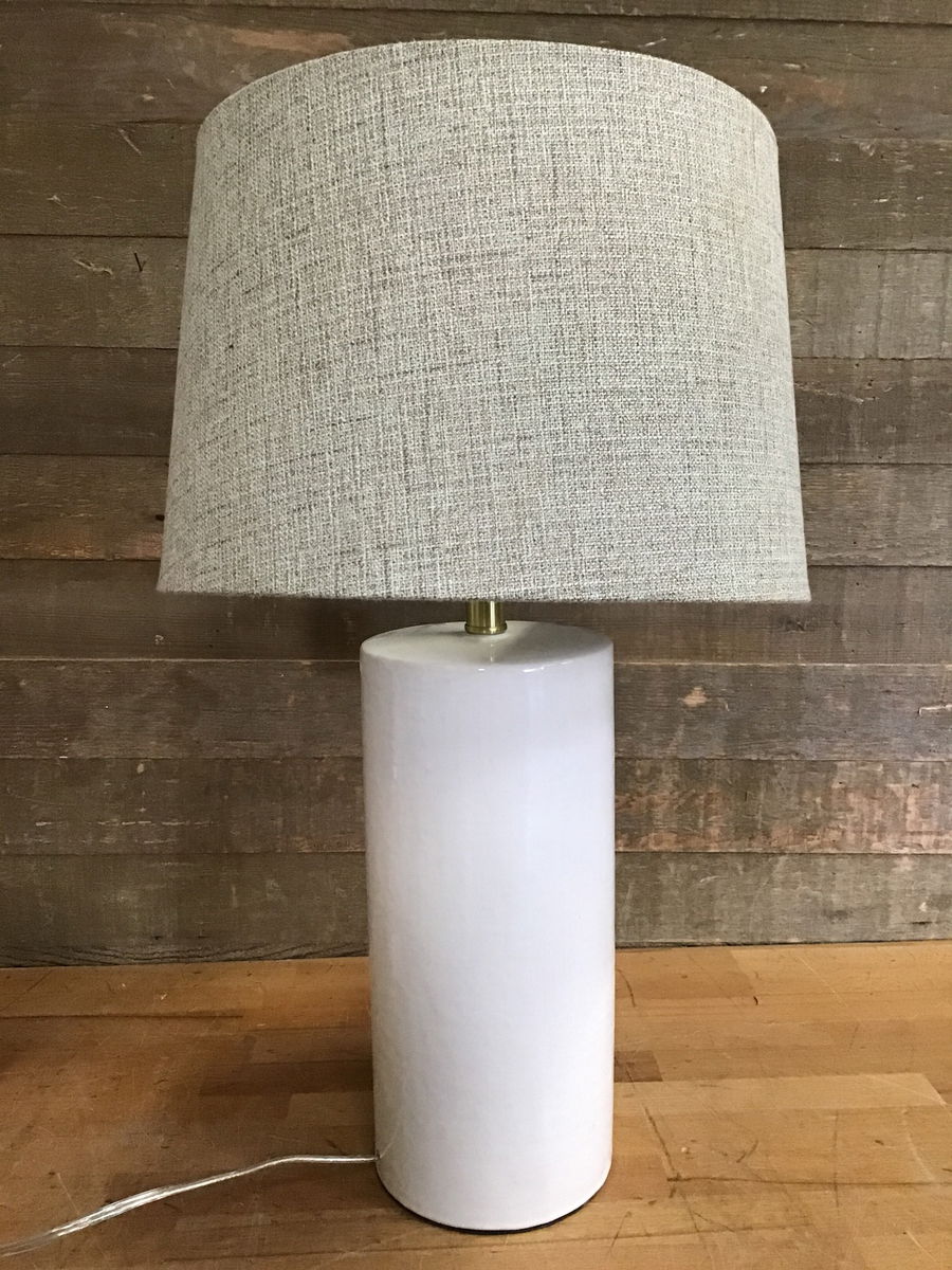 Round ceramic lamp with shade. Neutral colors fit into almost any room.