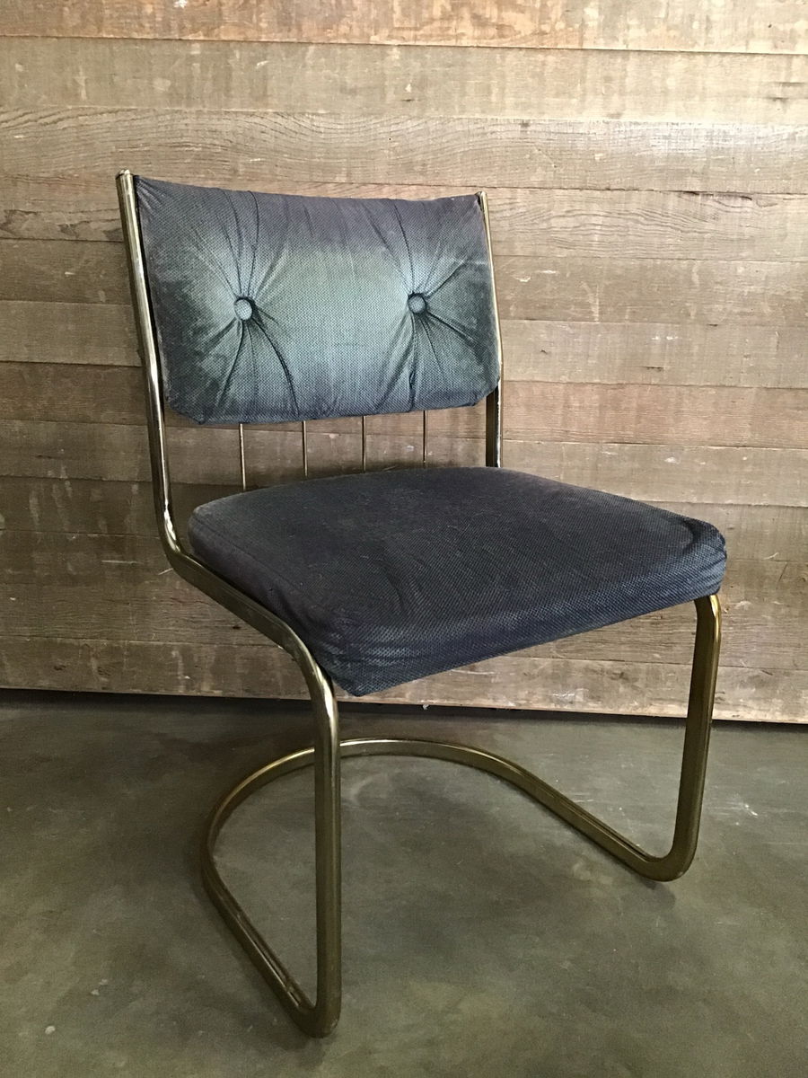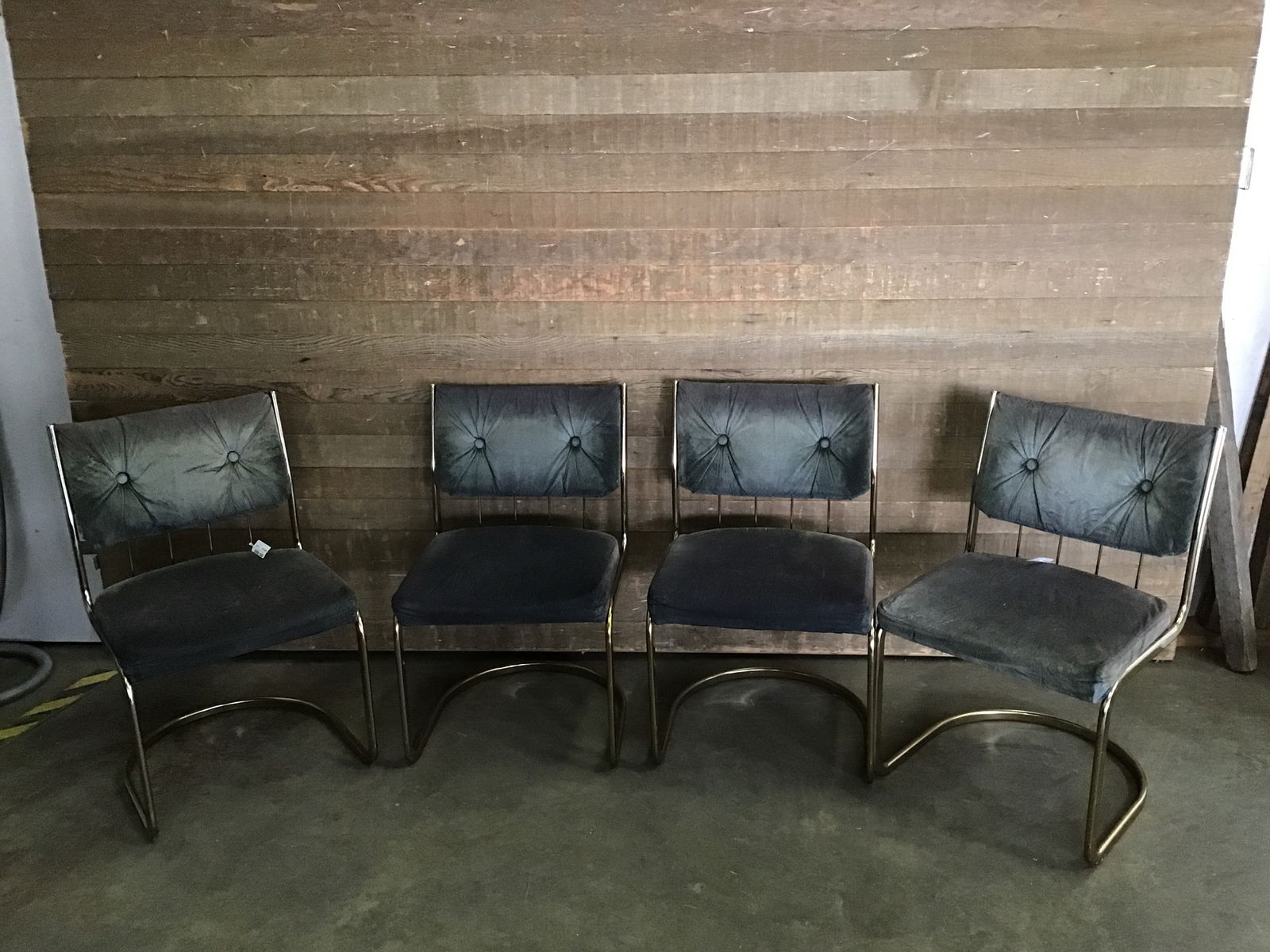 4 gray velvet vintage Mid-century modern cantilever dining chairs in need of new upholstery. Beautiful steel frame stands sturdy but will need a new finish. Perfect project for the right person. Manufactured by Douglas Furniture of California.