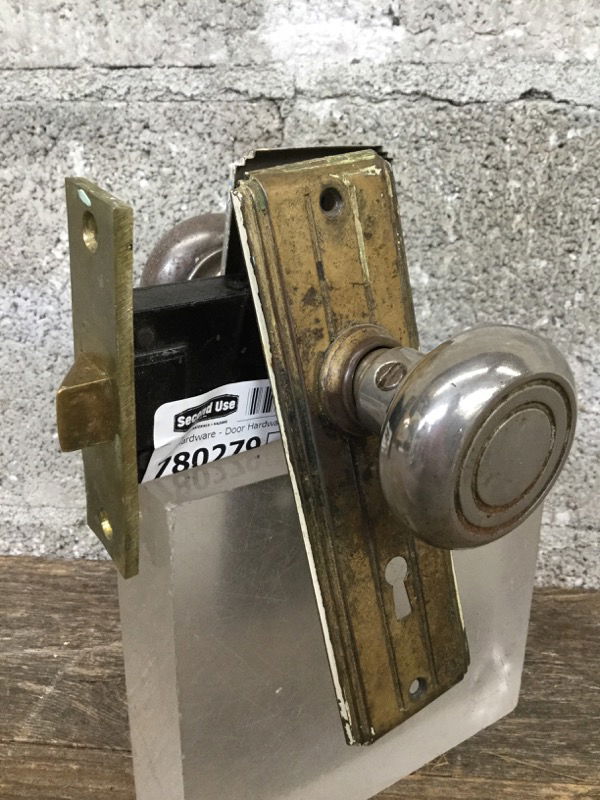 Beautiful round knob set with Art Deco lines. One side brass, one side chrome (like for a bathroom). Just needs a little cleaning. Dimensions given are for the escutcheon. Ready for your period knob replacement!