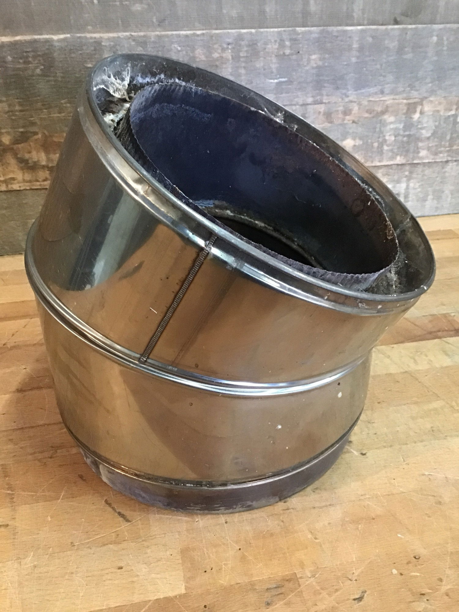 8" double wall, insulated elbow stove pipe in good, used condition. Measures 11" in total length.