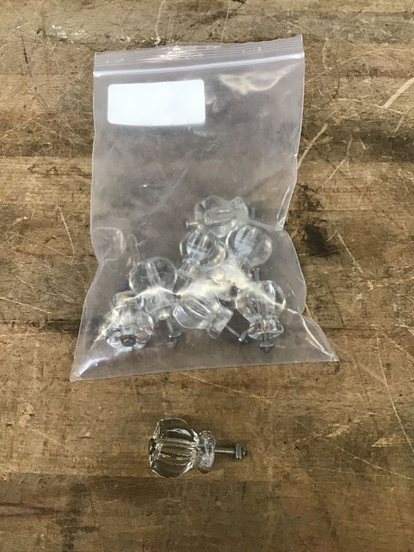 A set of 8 small fluted glass knobs with a nickel bolt. I believe they are vintage, given the natural wear and rubbing, but can not confirm that.