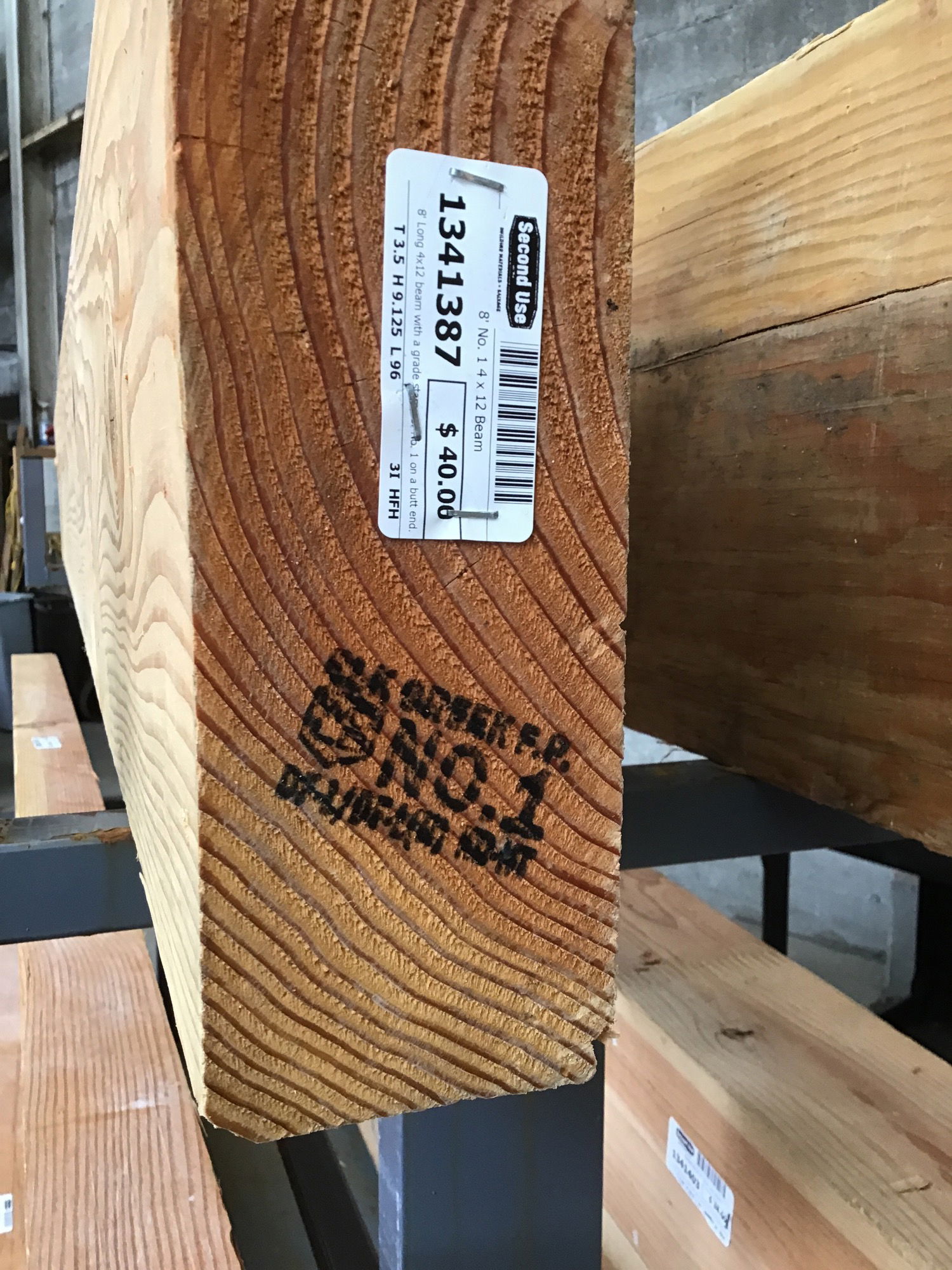 8' Long 4x12 beam with a grade stamp of No. 1 on a butt end. Green 4x12s are $9.70 per LF at Limback.
