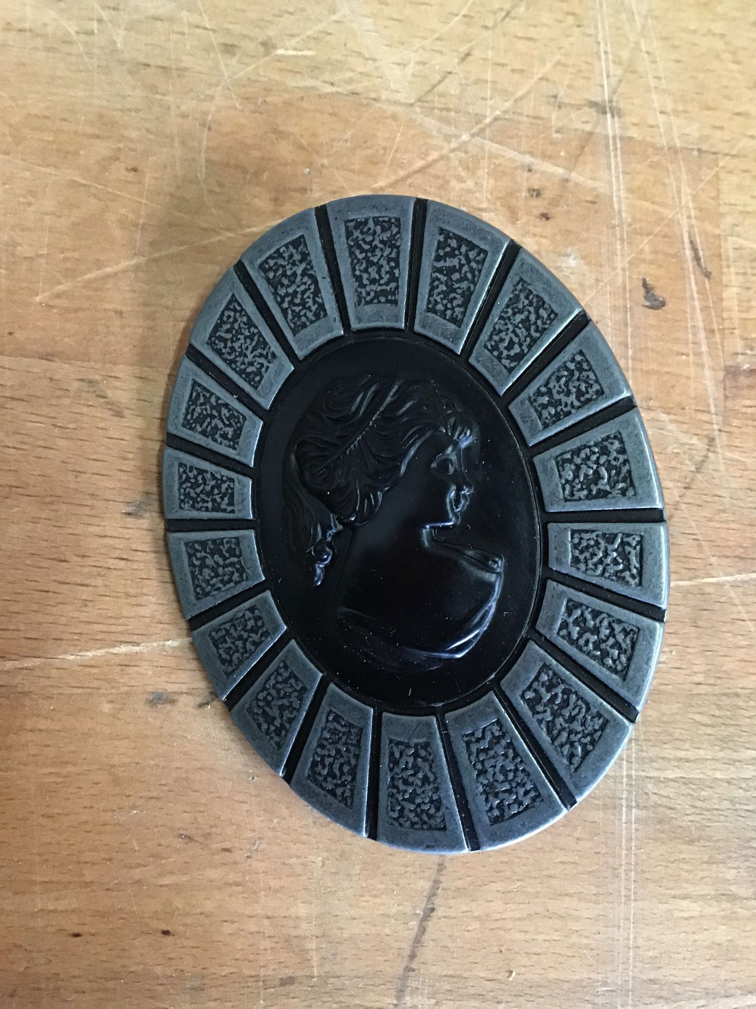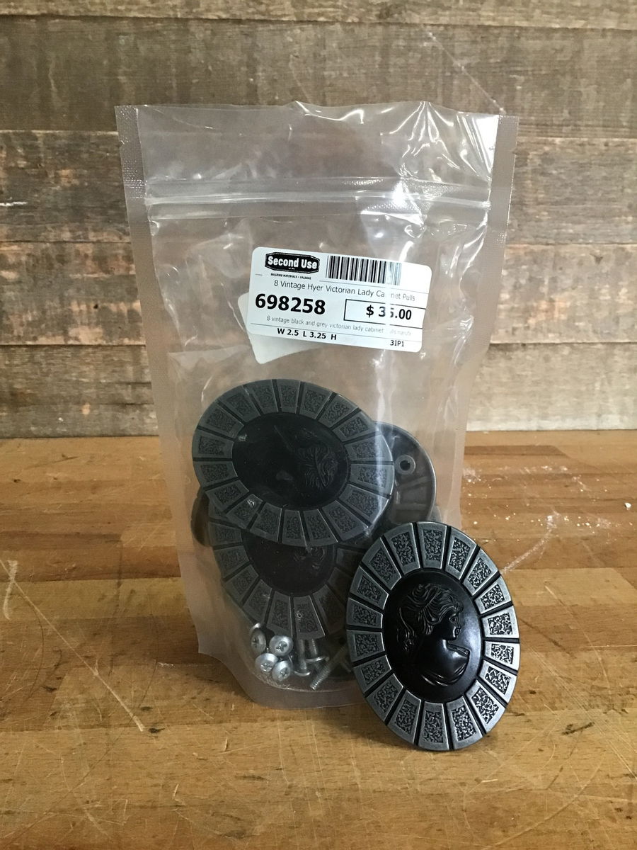 8 vintage black and grey victorian lady cabinet pulls manufactured by Hyer. Screw hole space is 2.5 inches.