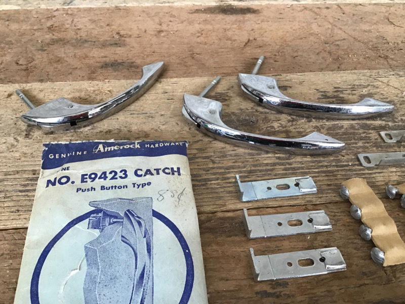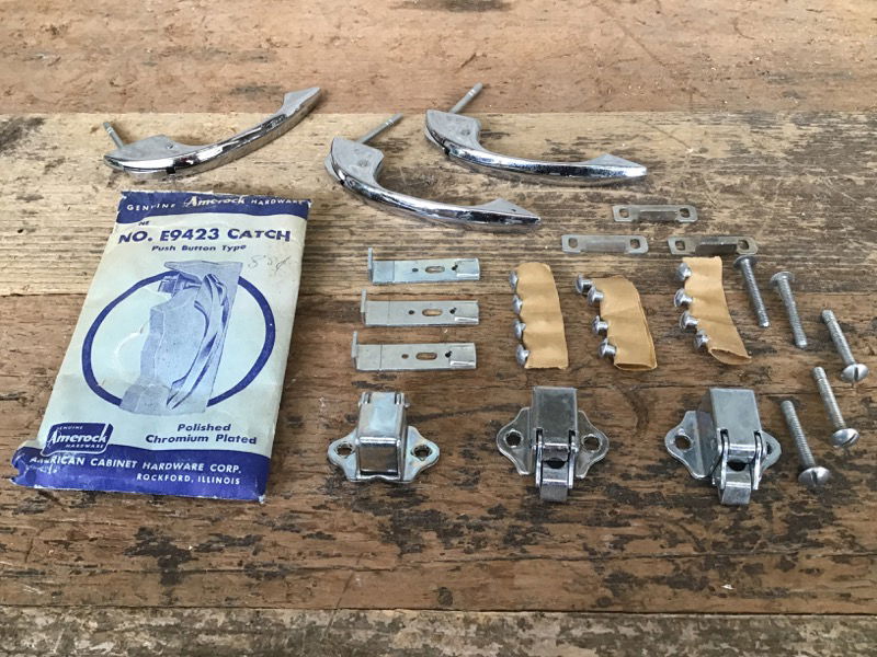 Set of three matching vintage chrome push button cabinet pulls with all their original hardware, fasteners, installation instructions and even one original piece of packaging! Appear unused and ready to bring a touch of flare to your next project.
