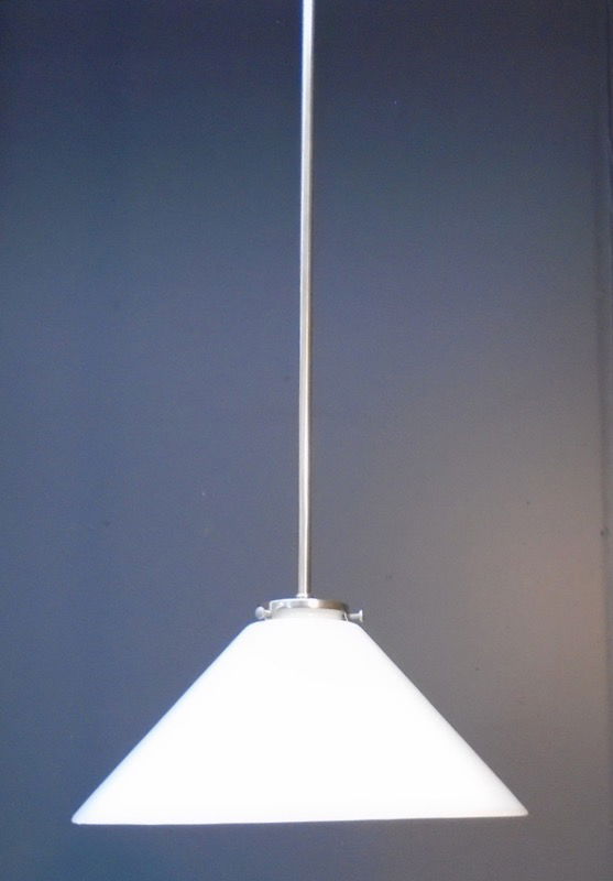 An antique white hand blown glass conical shade hangs from an antique style pendant base made by Antique Light Seattle. A classic style that would work in a vintage, or modern style home!