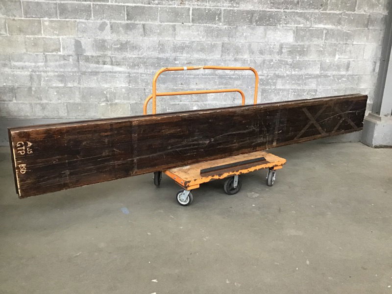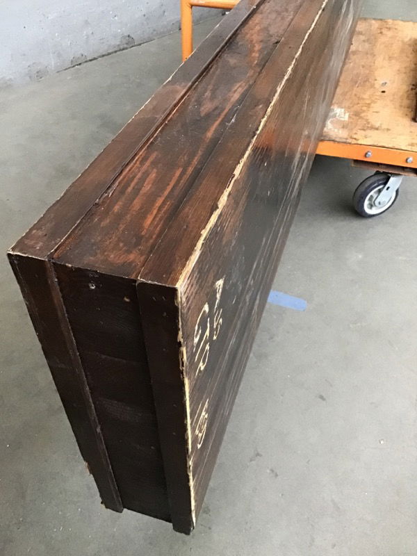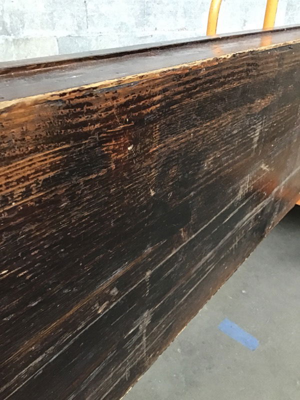 Salvaged from Alki Beach Pub. Made from a glulam beam with a epoxy pour top. Dark stained and trimmed on front and left side.