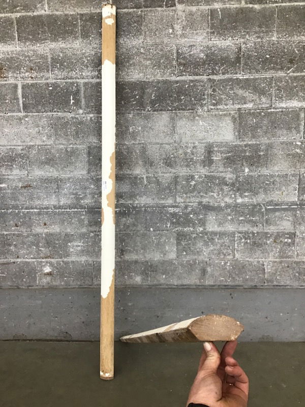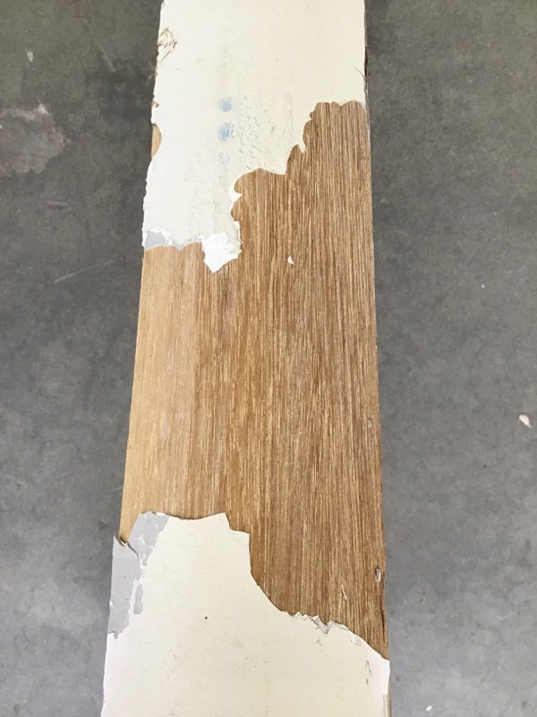 Thick mahogany trim that's meant to fit into an inside corner (sort of like really big quarter round). It does have paint on it, which is starting to peel off. The mahogany underneath looks solid. It just has a little wear from former fasteners on each end.
