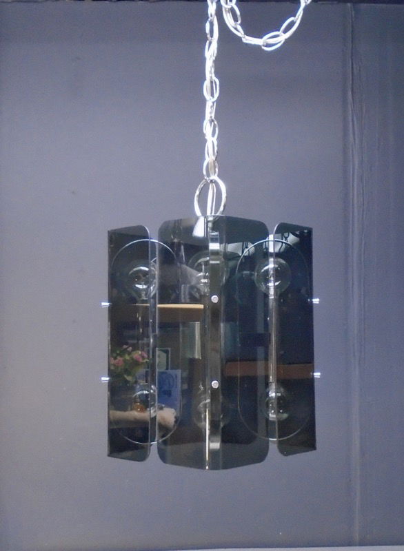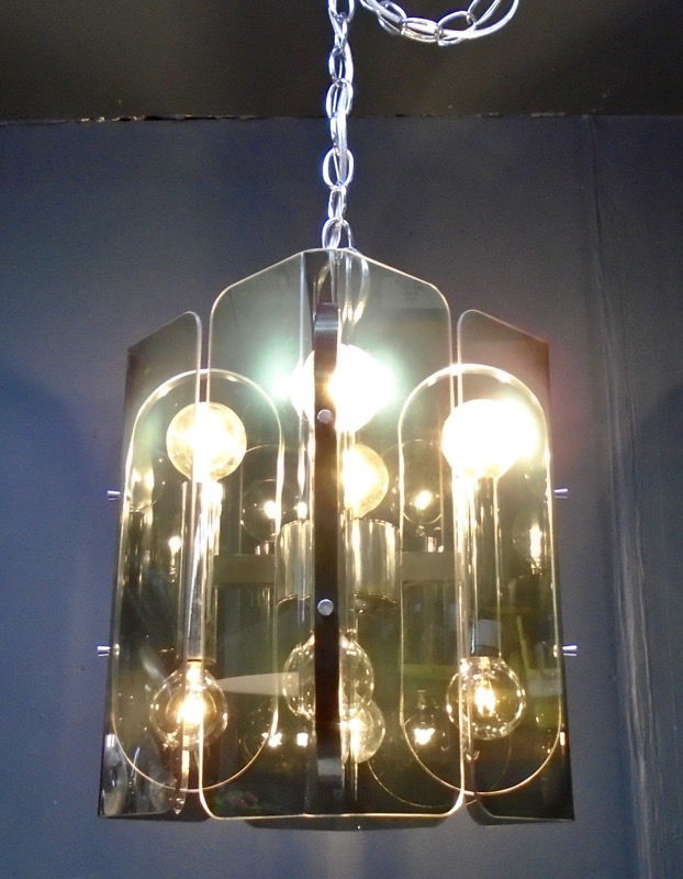 A stunning chrome and smoke lucite 8 bulb hanging light fixture from Forecast for Lightolier in the 1970s. Not certain of the designer, as I could not find this design anywhere on the internets. It looks like some of the work of Robert Sonneman, but I am not certain. Restored in our on site lighting repair shop.