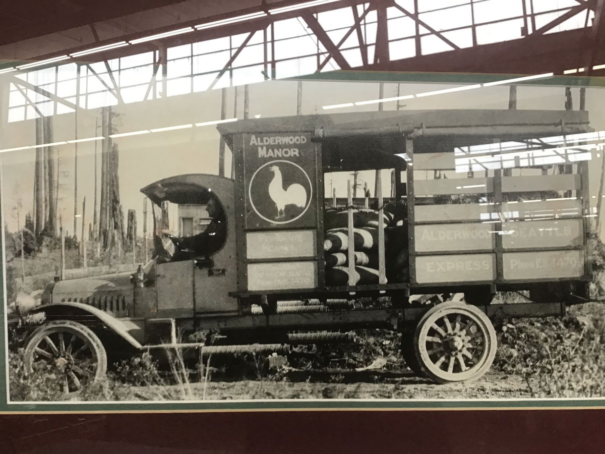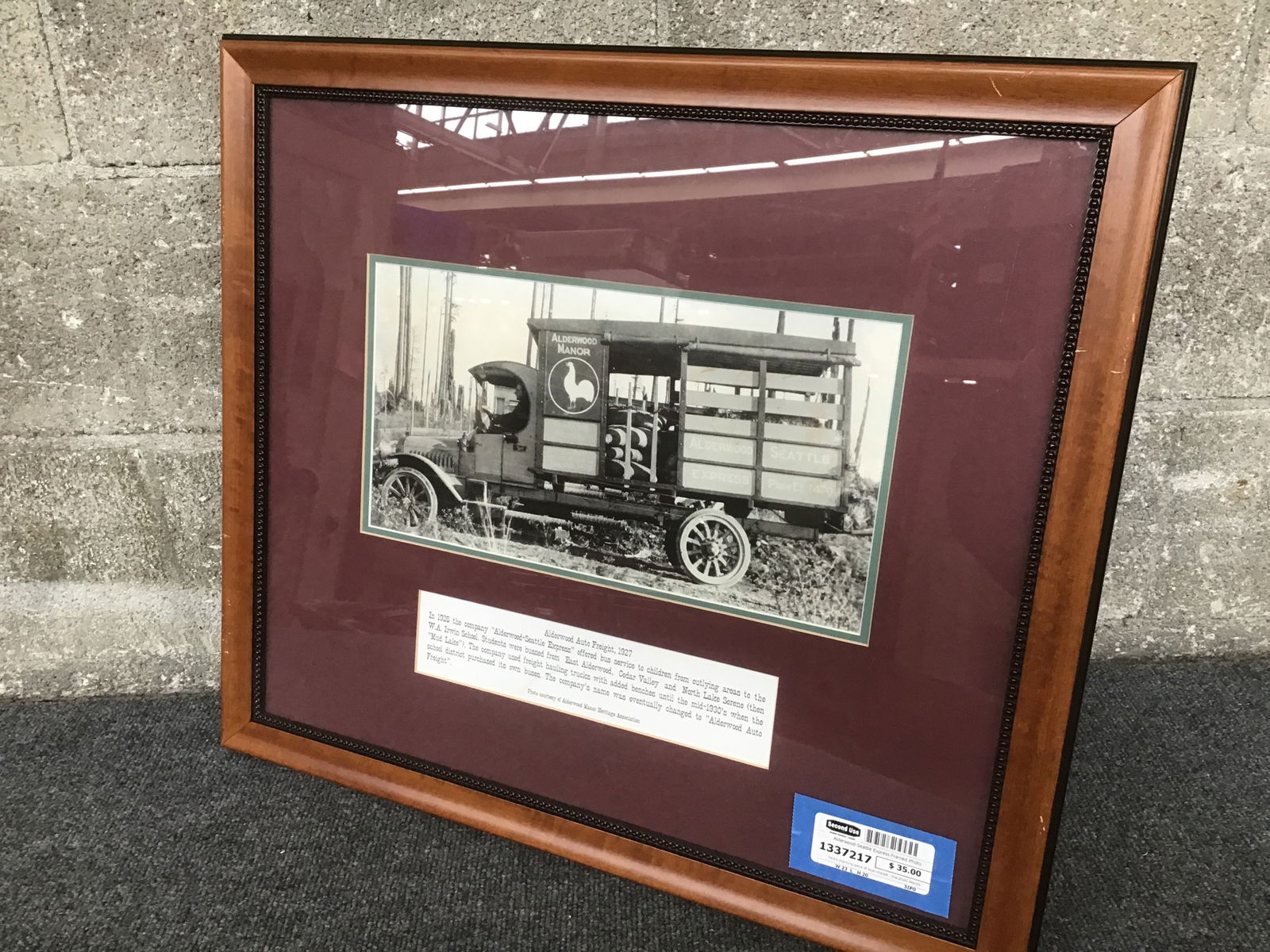 Here's charming piece of local interest - this photo depicts a real old school farm truck with "Alderwood Manor" and a handsome chicken on the side, with a caption recounting the Alderwood-Seattle bus service the vehicle provided for local schoolchildren in the 1920s-30s. Sweet! The photo is professionally matted and mounted, though the frame has a couple small scuffs.