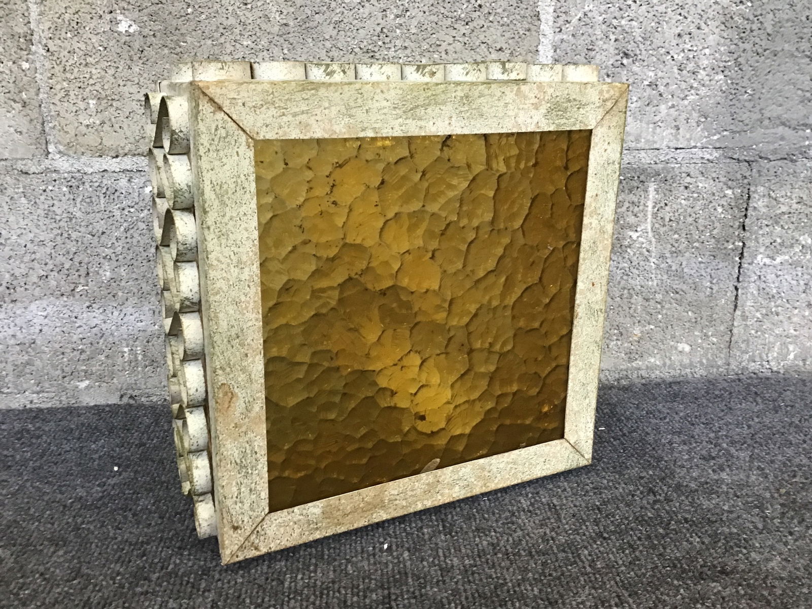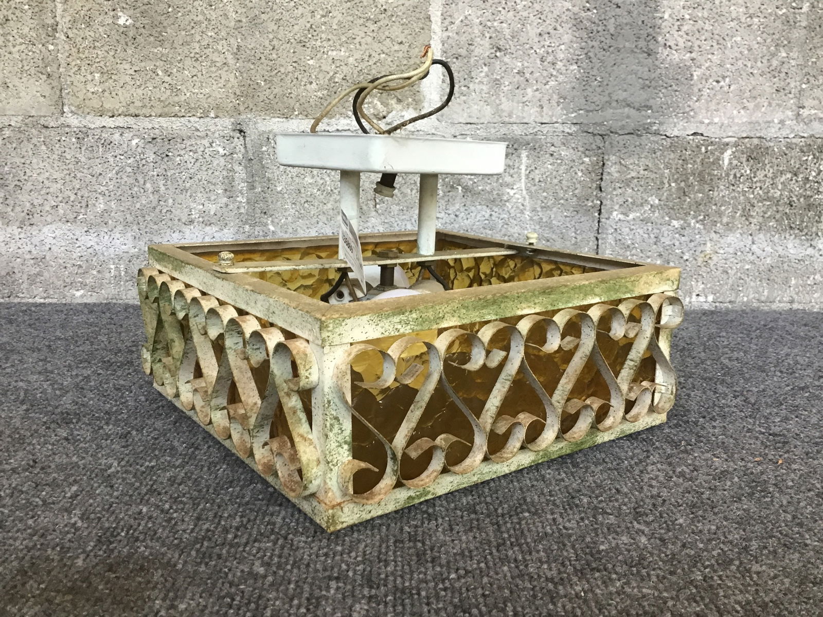 Cute vintage ceiling light with panels of textured amber glass in a metal frame that features swirled designs on all sides. Takes two bulbs.