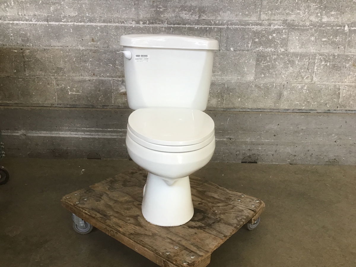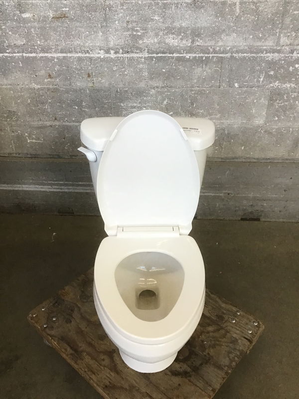 A white American Standard toilet with a 1.6 gallon flush. It looks to be from 2000 and seems in good shape. A good option for those looking to finish their never-ending bathroom project.