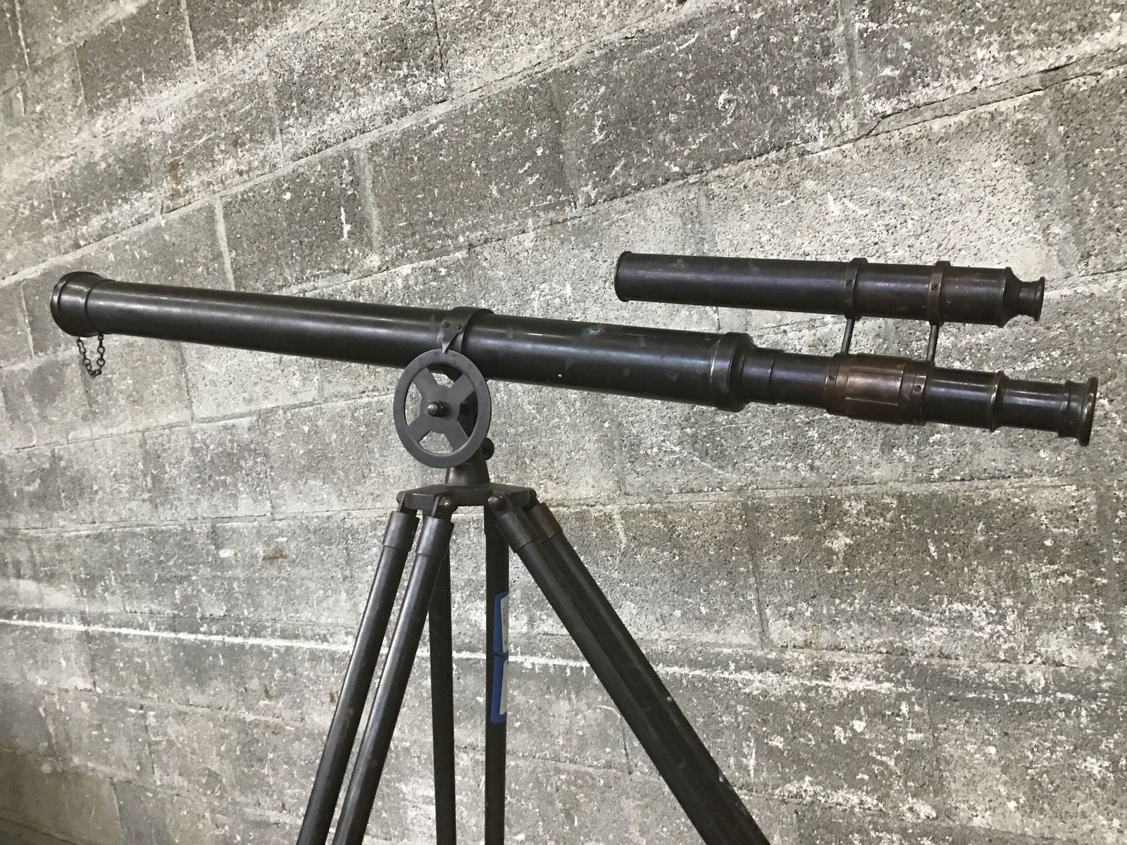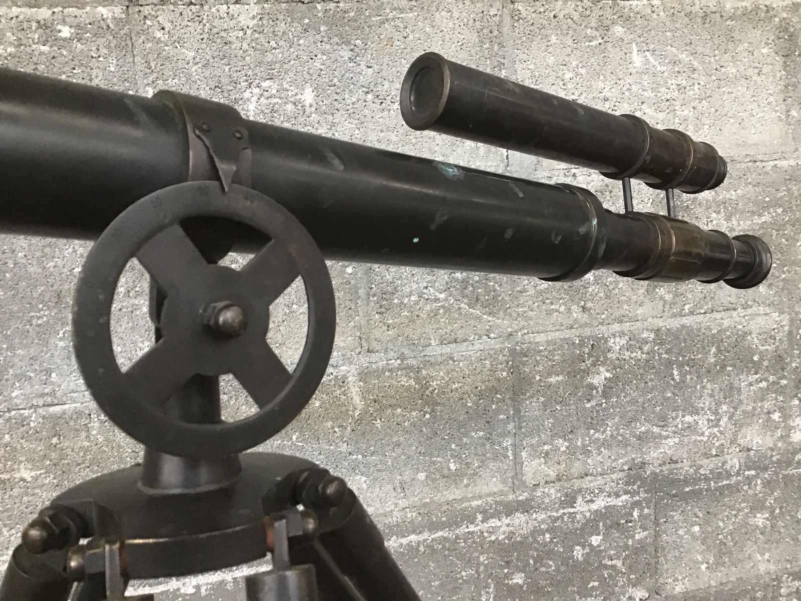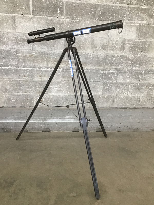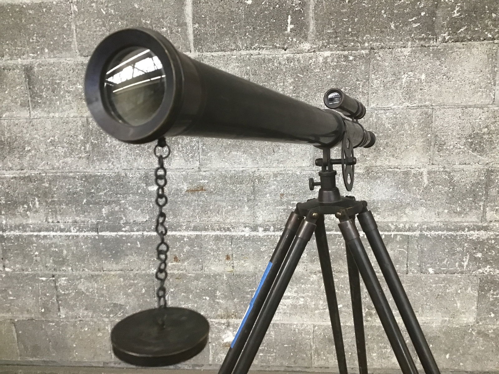 An antique solid brass telescope with a brass constructed tripod stand. This piece features two viewing lenses, one smaller to gage your view point and one larger for observation. The lenses are in working order, there are some minor chips due to its age but that is to be expected. Aside from functioning as a telescope, this piece breathes sleek, industrial aesthetics and aged opulence.