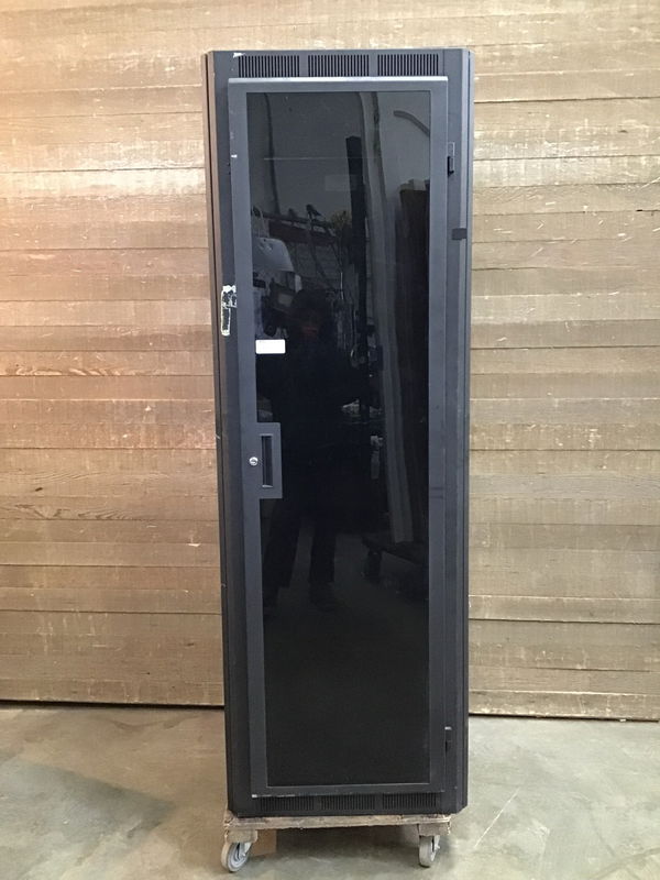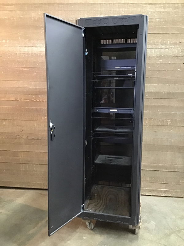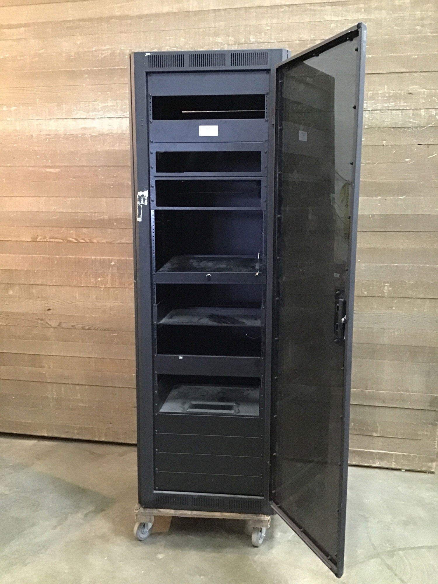 Good looking audiovisual rack featuring two doors and 6 shelves. Looks like both doors are able to lock but we sadly have no keys for it. Get that media room organized!
