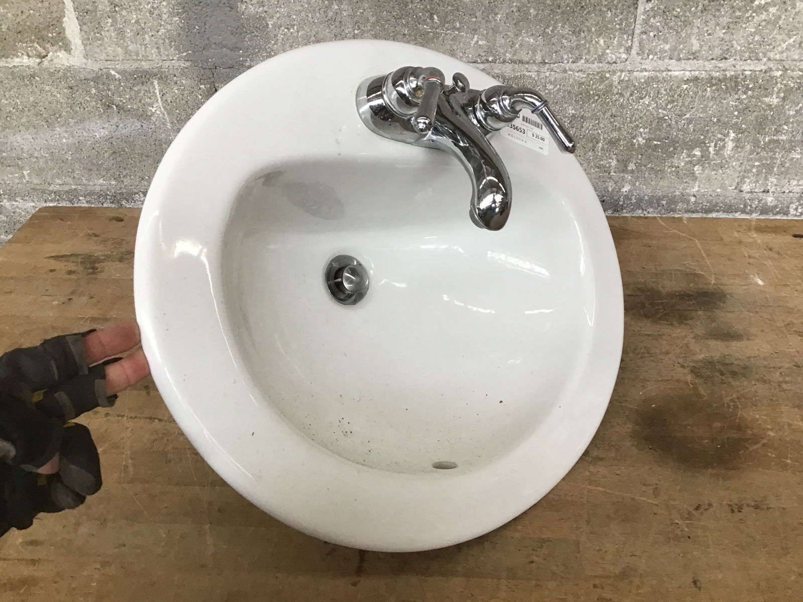 Porcelain drop in sink with a chrome faucet, ready for your project.