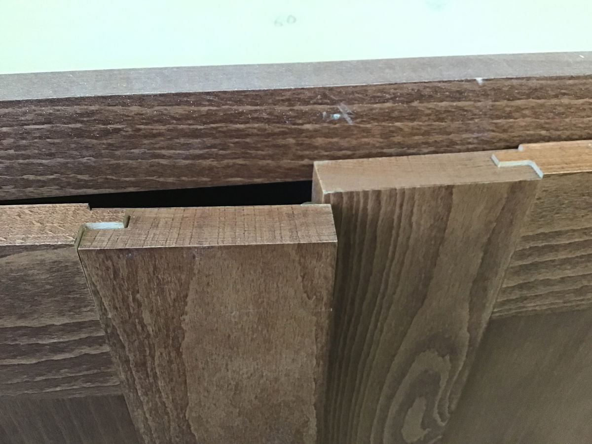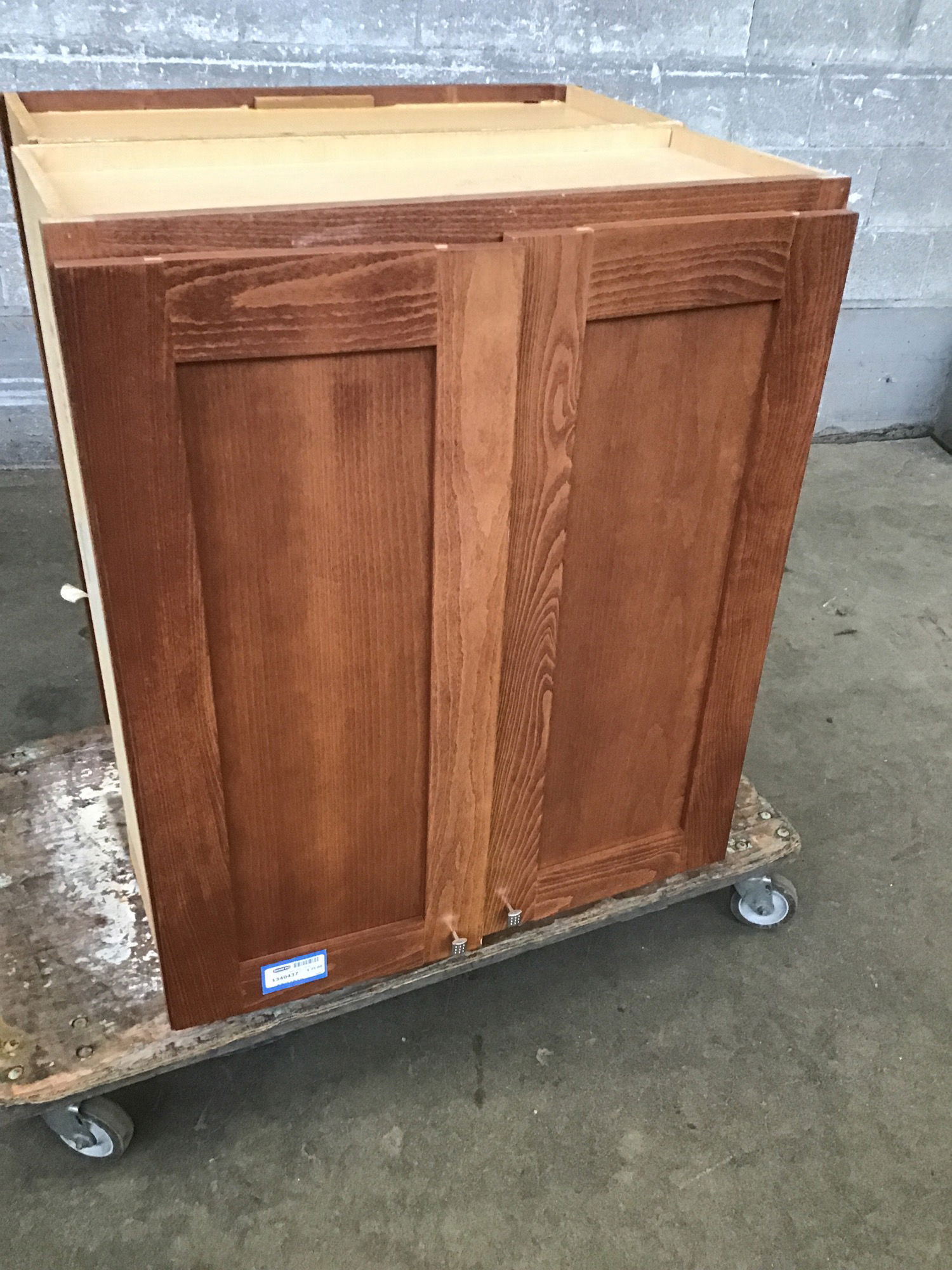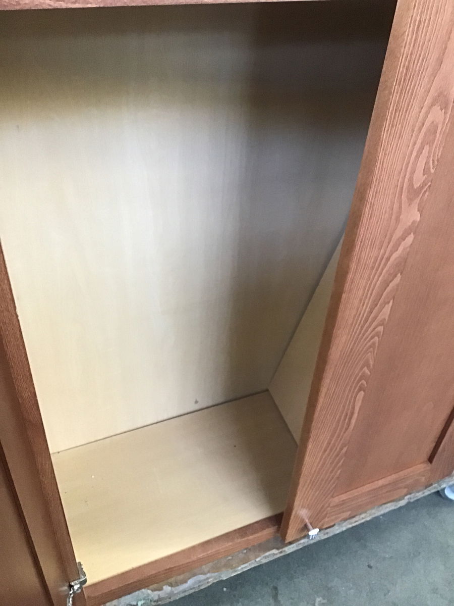 Shaker style upper cabinet with stained beech doors and two adjustable shelves (no pins...). The doors have gone a little wonky and don't completely close as a result. You could try your hand at fixing them or just resign these to low stakes shop life.
