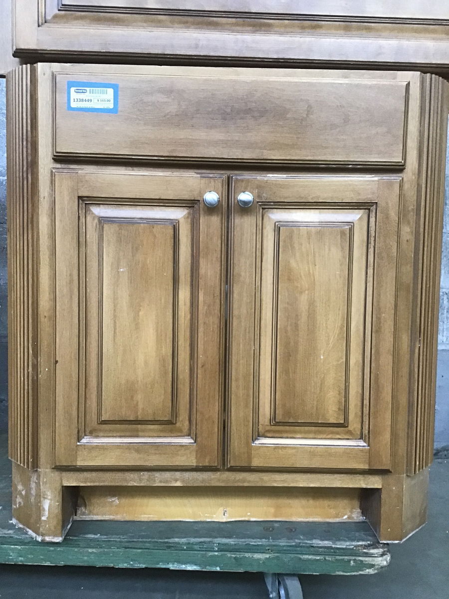 Medium-dark stained, raised panel ?birch? base cabinet with decorative angled trim on the front corners that goes down to the floor around the toe kick. Kind of a cool look.