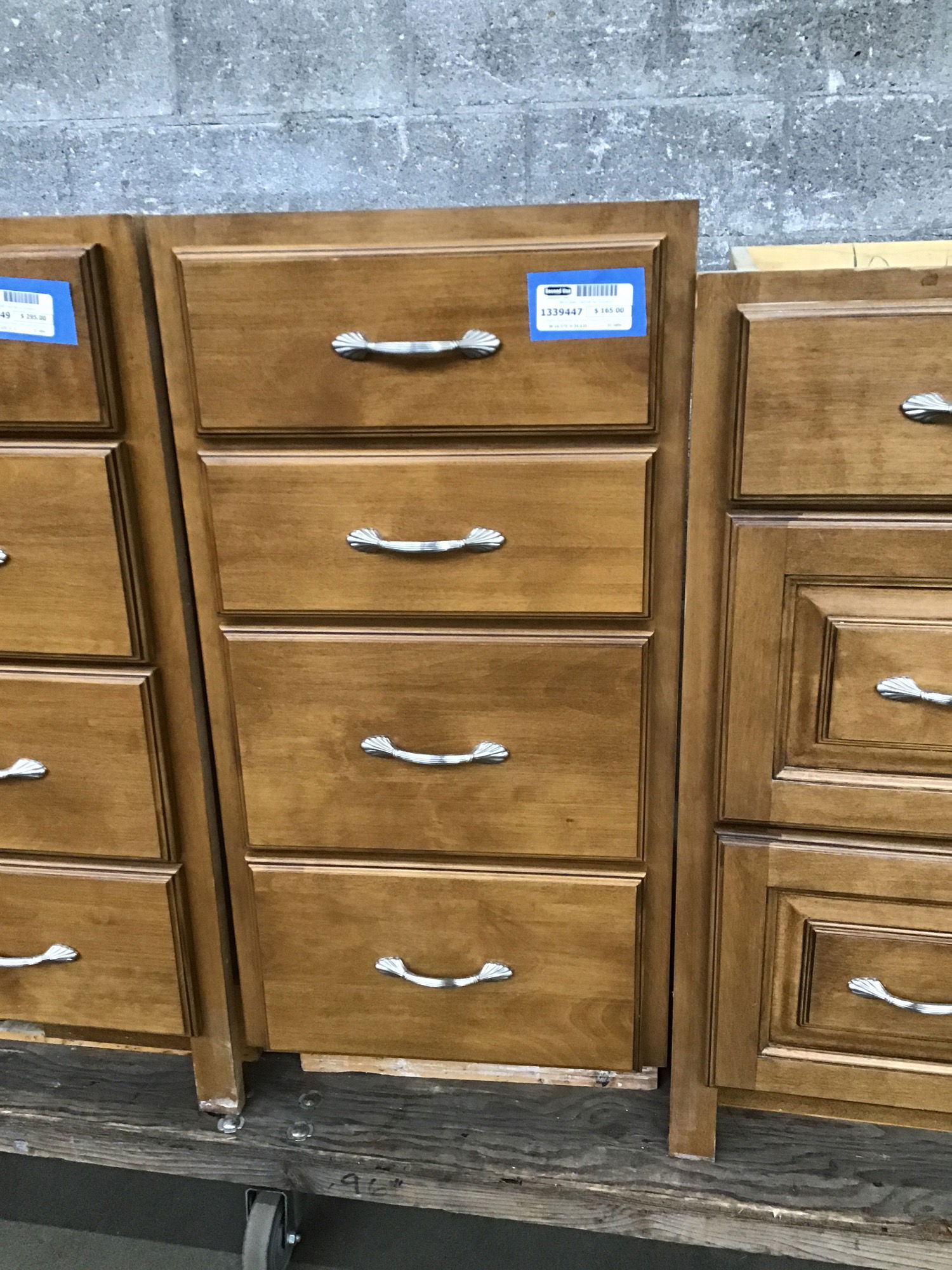 Medium dark stained four drawer raised panel birch (I believe) bathroom base cabinet. Clean and free of damage. Has finished left side panel.