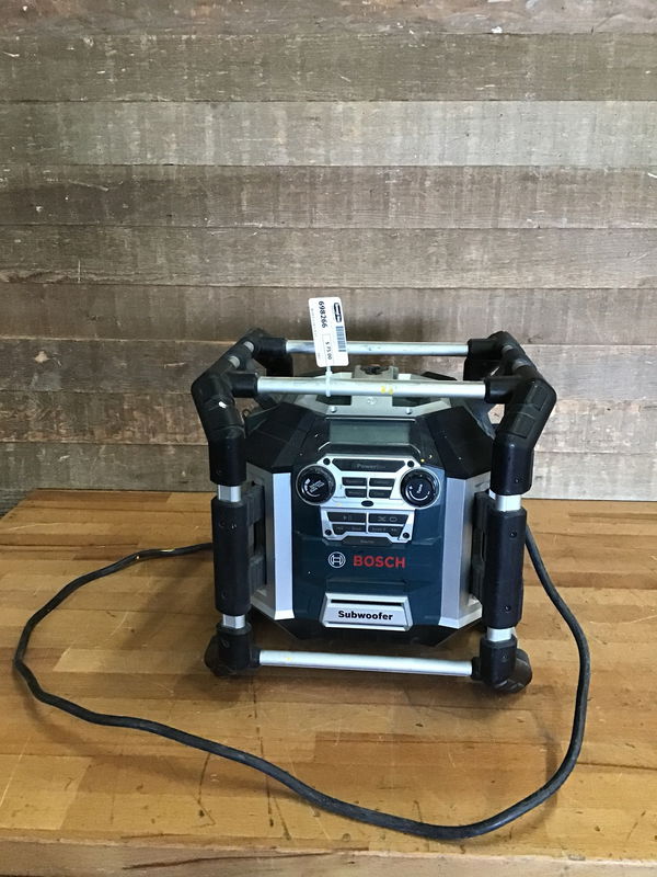 Bosch corded jobsite radio. Has a digital media bay, charger/battery bay and power outlets. Tested in house and appeared to function properly.