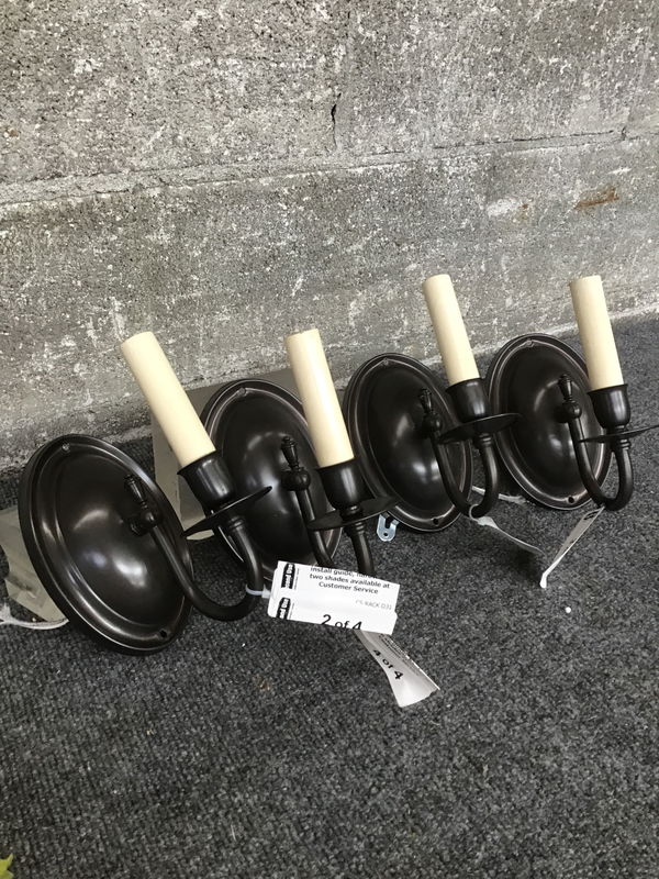 Set of four antiqued brass wall sconces in a Colonial style, all are clean and appears ready for use. You will need to hunt down two shades as this set only includes two currently.