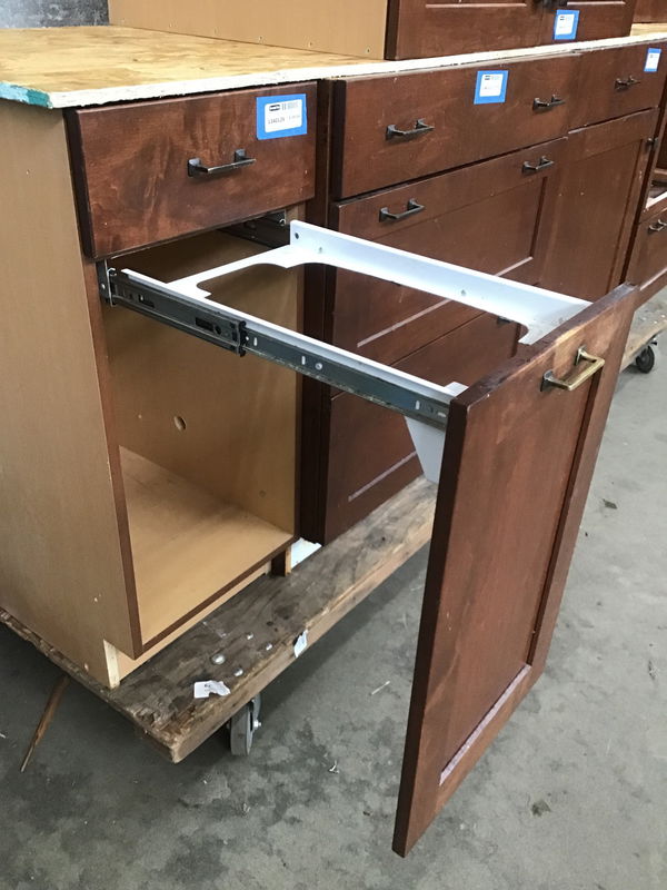 An attractive Shaker-style maple faced waste bin base cabinet with top drawer and antiqued brass Craftsman style pulls. Both drawers are full extension and the top has undermount hardware!