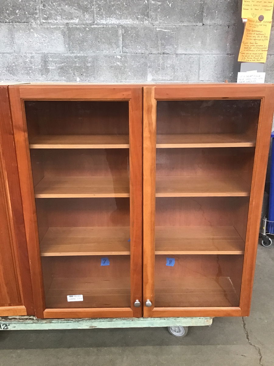 A cherry-faced cabinet with two glass doors, nickel pulls and three adjustable-height shelves inside.