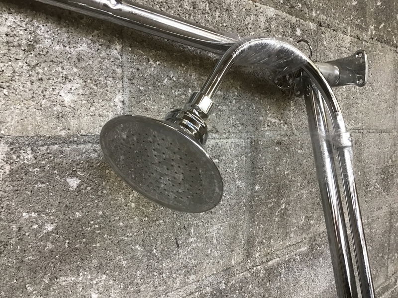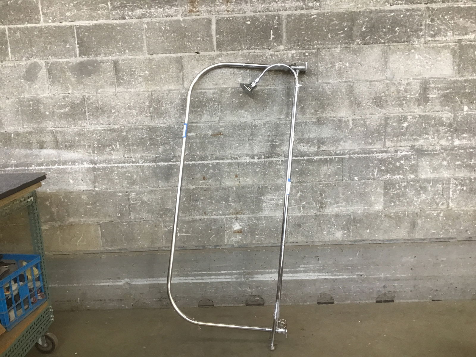 A chrome shower surround that comes with a shower head and tall spout. Includes hardware to mount to a wall.