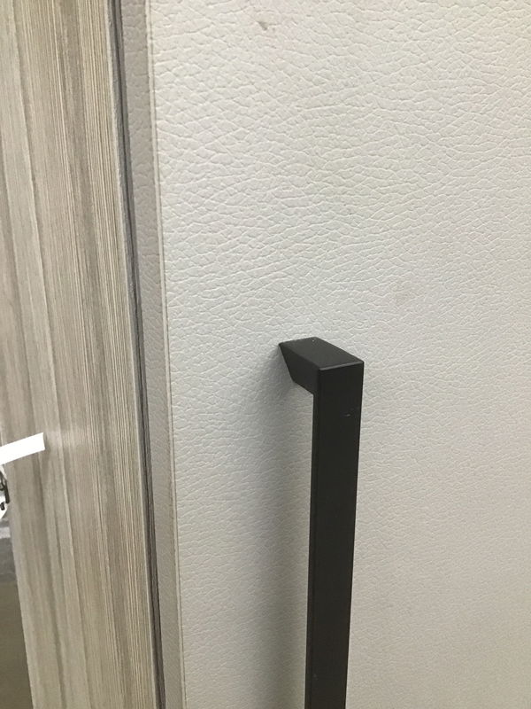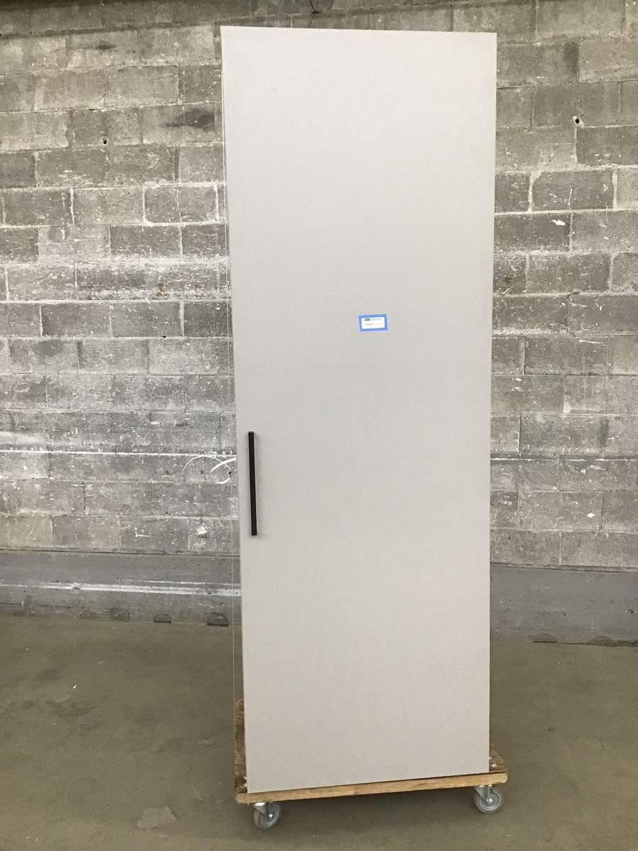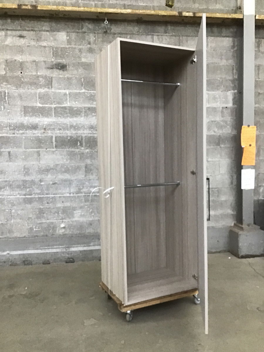 This is a large cabinet with one huge door that leads to a mostly empty storage space with two polished nickel closet rods for clothing storage. Has a laminate finish that is trying to be leather, but it's not leather.