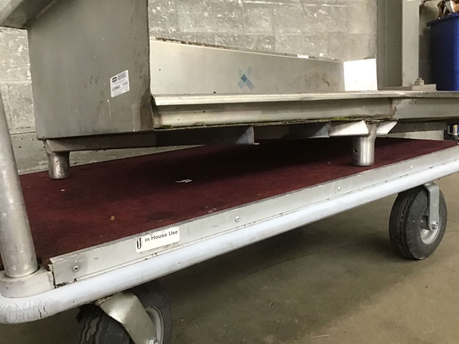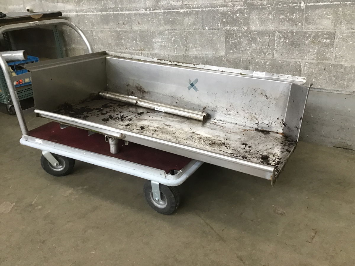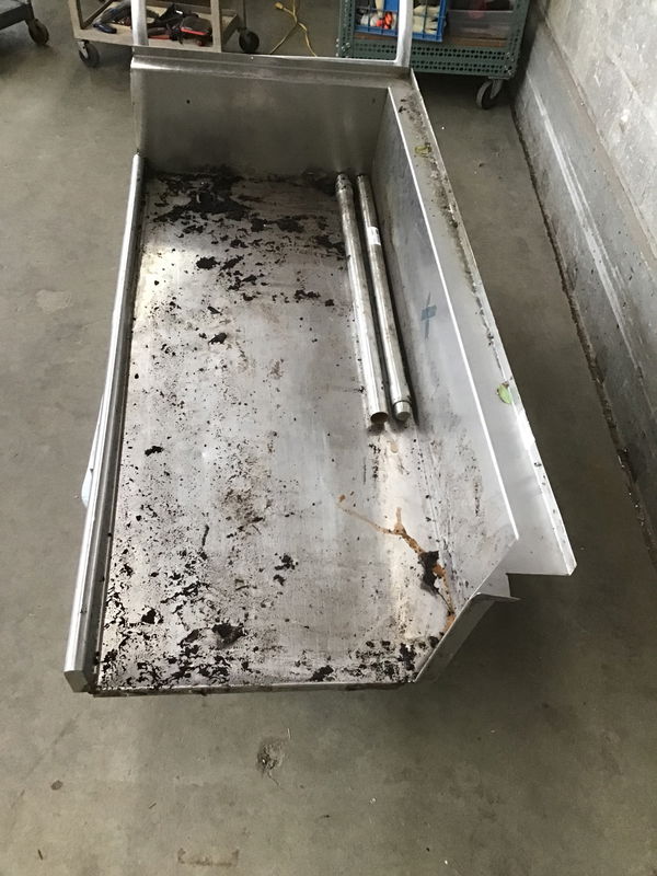 Stainless steel drainboard or feeder for a commercial dishwasher. Comes with two legs for the left side. The right side is supposed to join up to the dishwasher. Looks like someone left it sit outside for a couple seasons. You'll need to scrub the mud off. Height listed is to top of the backsplash. Dimensions listed are approximate.