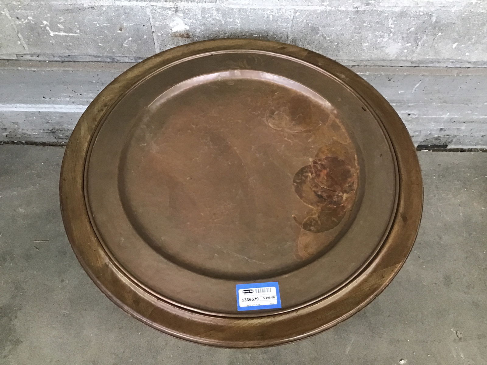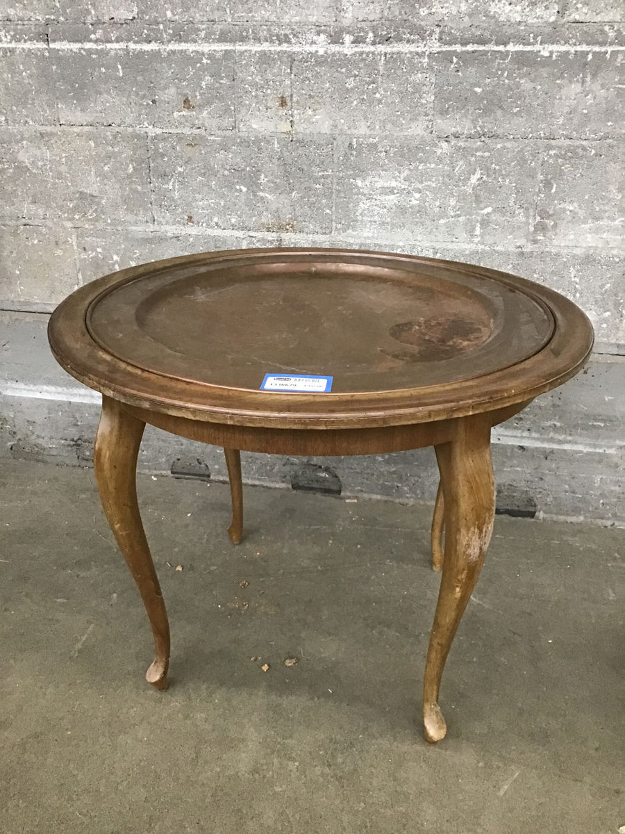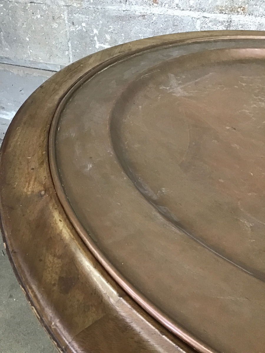 This table has a base made from walnut that has a light stain and the star of the show is the large hammered copper plate insert that sets in on the top. Has a bit of patina but you could get it buffed out if you wanted.
