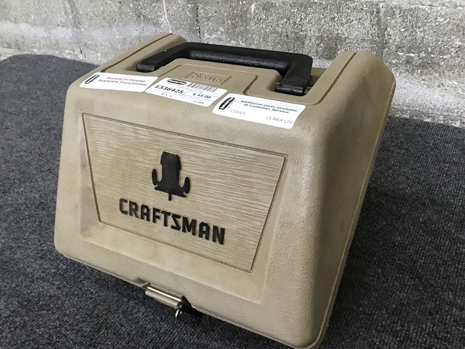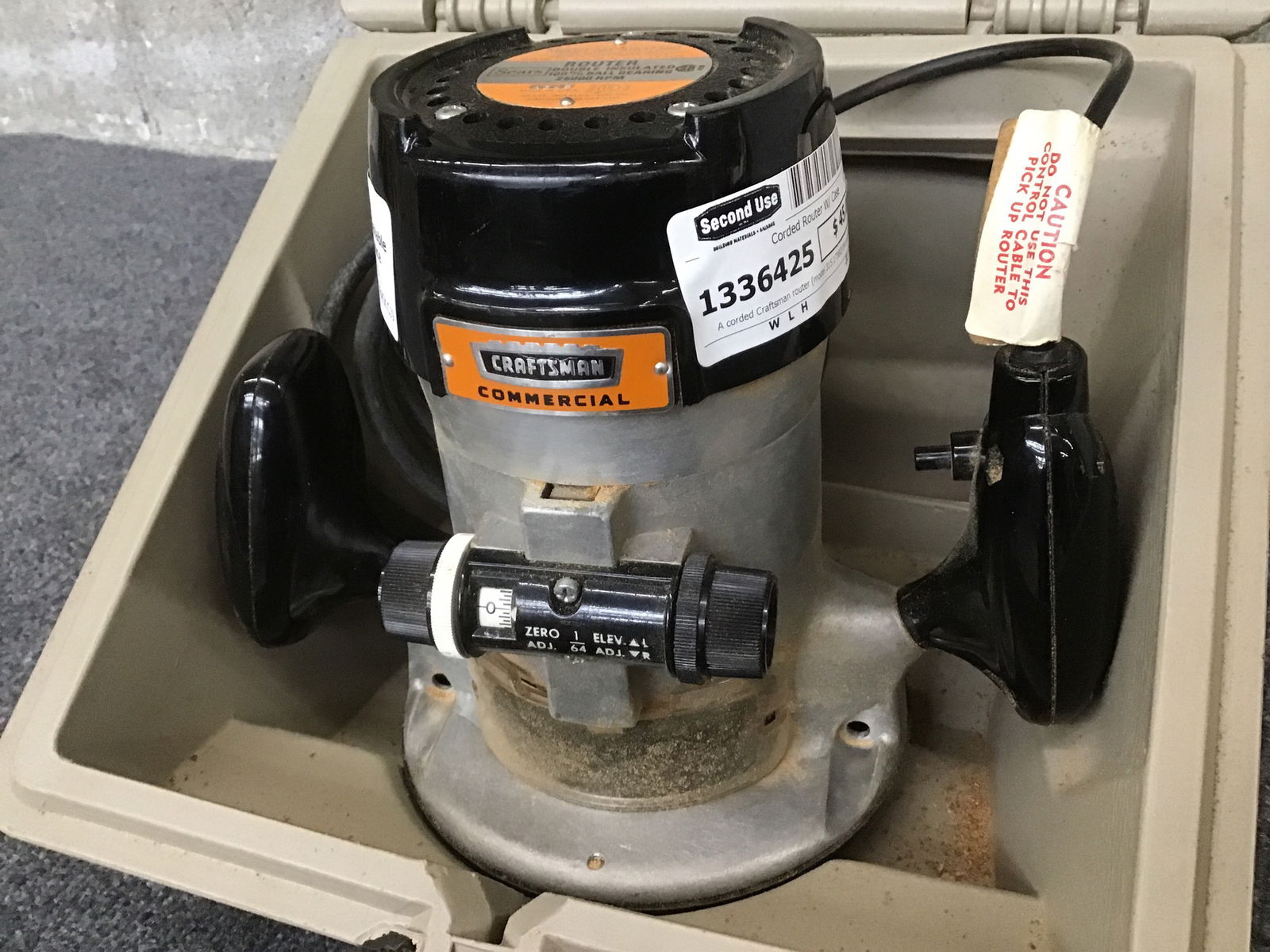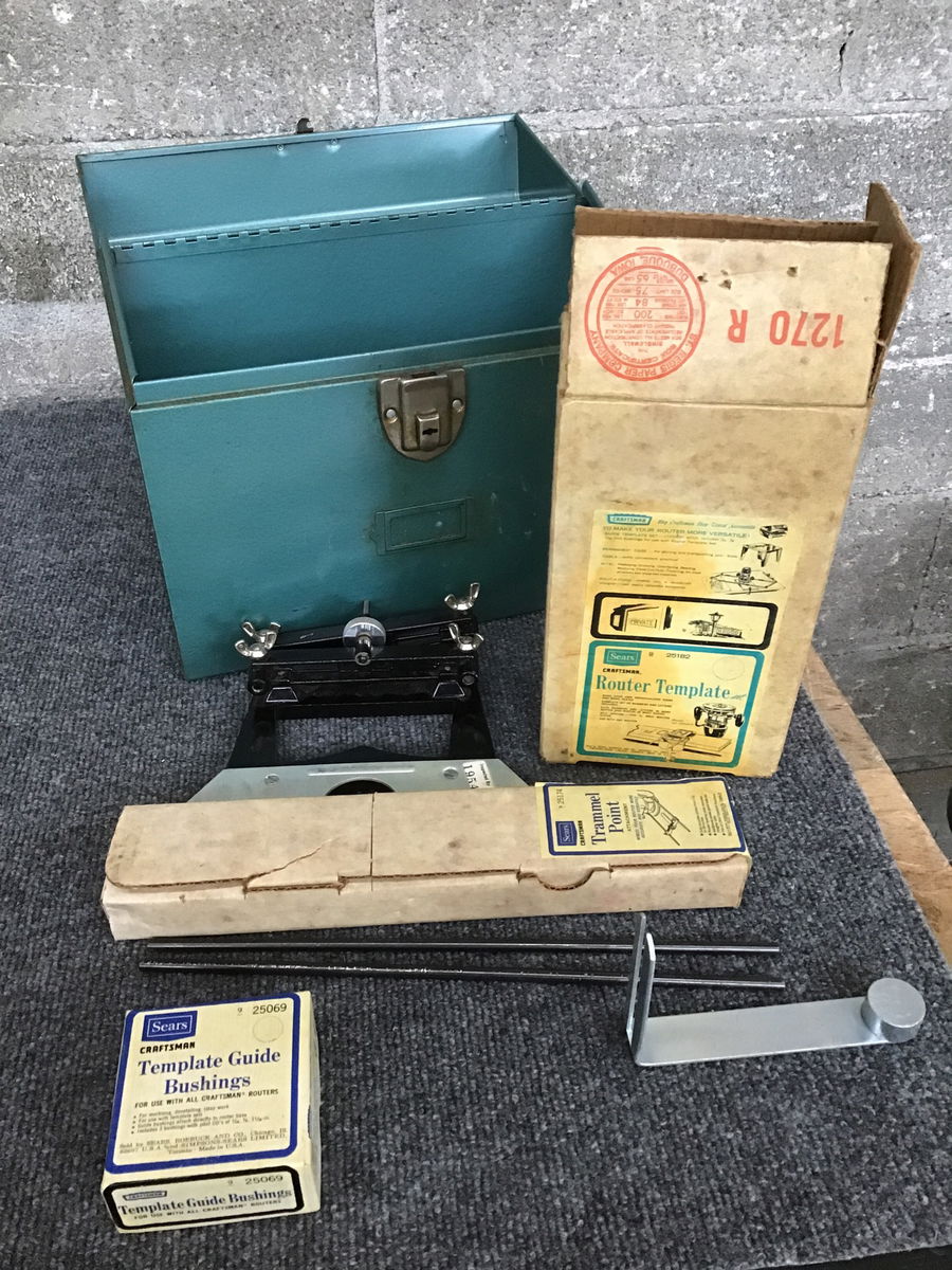 A corded Craftsman router (model 315.17380) that appeared functional when tested in-house- all parts. Comes with a beige hard carry case, and some other goodies: a tremmel point, a template guide, some bushings, all kept in their own green steel carry case.